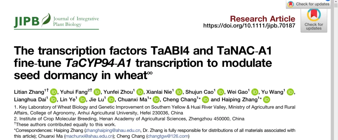 英文题目:The transcription factors TaABI4 and TaNAC-A1 fine-tune TaCYP94-A1 transcription to modulate seed dormancy in wheat