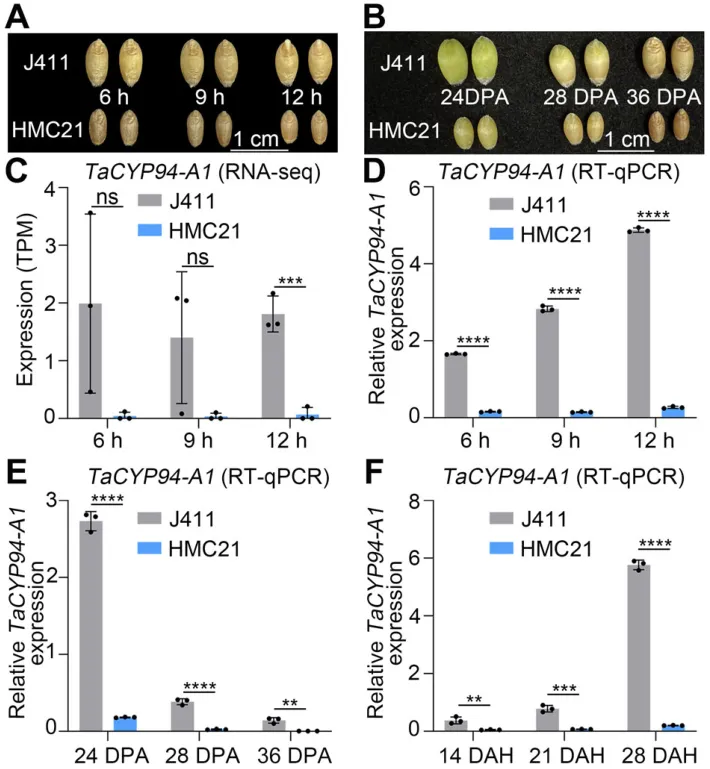 CYP450基因在拟南芥种子休眠调控中发挥重要作用。为探究该基因家族是否同样参与小麦种子休眠的调控,本研究首先分析了弱休眠小麦品种京411(J411)和强休眠小麦品种红芒春21(HMC21)种子吸胀6、9、12h(代表休眠解除过程)的转录组数据(图1A),共筛选出12个在两个品种间差异表达的CYP450基因(图1C),后续通过实时荧光定量PCR(RT-qPCR)验证了其表达模式,结果与转录组数据一致(图1D)。