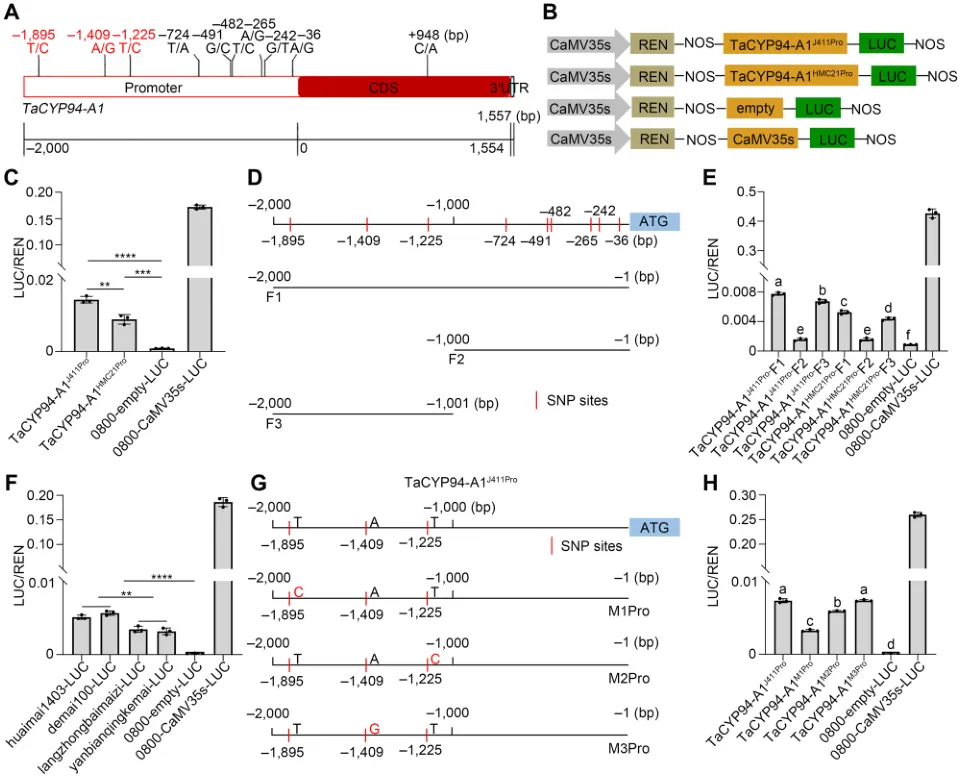 图2. TaCYP94-A1的序列变异与启动子活性分析。(A)弱休眠小麦品种京411(J411)和强休眠小麦品种红芒春21(HMC21)中TaCYP94-A1的序列分析。(B)用于检测两个TaCYP94-A1启动子变体(TaCYP94-A1J411Pro和TaCYP94-A1HMC21Pro)活性的报告载体结构示意图。萤火虫荧光素酶(LUC)作为报告基因,海肾荧光素酶(REN)作为内参基因。(C)小麦原生质体中TaCYP94-A1启动子变体的活性检测结果。以强启动子CaMV35s作为阳性对照,0800-empty-LUC启动子作为阴性对照。数据以平均值±标准差表示(n=3),采用Student's t检验进行统计分析(**P<0.01,***P<0.001,****P<0.0001)。(D)TaCYP94-A1启动子截短片段的结构示意图。(E)转录激活实验结果表明,远端启动子片段(F3)中的SNP是导致(TaCYP94-A1J411Pro和TaCYP94-A1HMC21Pro)启动子活性差异的关键因素。数据以平均值±标准差表示(n=3),不同字母(a-f)表示经单因素方差分析(ANOVA)结合Tukey检验后存在显著差异(P<0.05)。(F)两个强休眠小麦品种(阆中白麦子、延边青稞麦)与两个弱休眠小麦品种(淮麦1403、德麦100)在小麦原生质体中的启动子活性比较。阆中白麦子和延边青稞麦携带与TaCYP94-A1HMC21Pro一致的等位基因组合(C,-1895bp;G,-1409bp;C,-1225bp),淮麦1403和德麦100携带与TaCYP94-A1J411Pro对应的等位基因组合(T,-1895bp;A,-1409bp;T,-1225bp)。数据以平均值±标准差表示(n=3),采用Student's t检验进行统计分析(**P<0.01,****P<0.0001)。(G)在TaCYP94-A1J411Pro启动子背景下进行定点突变的结构示意图。(H)小麦原生质体中,TaCYP94-A1J411Pro背景下三个SNP位点(T/C,-1895bp;A/G,-1409bp、T/C,-1225bp)定点突变后的转录活性变化。数据以平均值±标准差表示(n=3),不同字母(a-d)表示经单因素方差分析(ANOVA)结合Tukey检验后存在显著差异(P<0.05)。