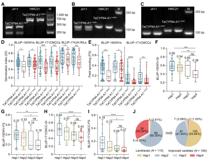 图3. TaCYP94-A1启动子序列变异与种子休眠的关联性及等位基因频率分析。(A-C)基于小麦品种京411(J411)和红芒春21(HMC21)的TaCYP94-A1启动子区三个突变位点(T/C,-1895bp;A/G,-1409bp;T/C,-1225bp),开发了三个酶切扩增多态性序列(CAPS)标记(TaCYP94-A1¹⁸⁹⁵,TaCYP94-A1¹⁴⁰⁹,TaCYP94-A1¹²²⁵)。(D)在192份不同休眠性小麦品种(192WVs)、171份中国小麦微核心种质(171CMCCs)和174份京411×红芒春21重组自交系(174JH-RILs)中,TaCYP94-A11895(TaCYP94-A11895T和TaCYP94-A11895C)和TaCYP94-A11225(TACYP94-A11225T和TaCYP94-A11225C)的两种等位基因在萌发指数(GI)上存在显著差异。数据以平均值±标准差表示,采用Student's t检验进行统计分析(*P<0.05,**P<0.01,***P<0.001)。(E)在192WVs和171CMCCs中,TaCYP94-A1¹⁸⁹⁵(TaCYP94-A11895T和TaCYP94-A11895C)和TaCYP94-A1¹²²⁵(TaCYP94-A11225T和TaCYP94-A11225C)的两种等位基因在田间穗发芽率(FS)上存在显著差异。数据以平均值±标准差表示,采用Student's t检验进行统计分析(*P<0.05,**P<0.01,****P<0.0001)。(F-I)192WVs和171CMCCs中TaCYP94-A1的单倍型分析结果。数据以平均值±标准差表示,采用Student's t检验进行统计分析(*P<0.05,**P<0.01,***P<0.001,****P<0.0001),“ns”表示差异不显著。(J)115份地方品种和195份改良品种中,单倍型Hap1、Hap2、Hap3和Hap4的频率分布。