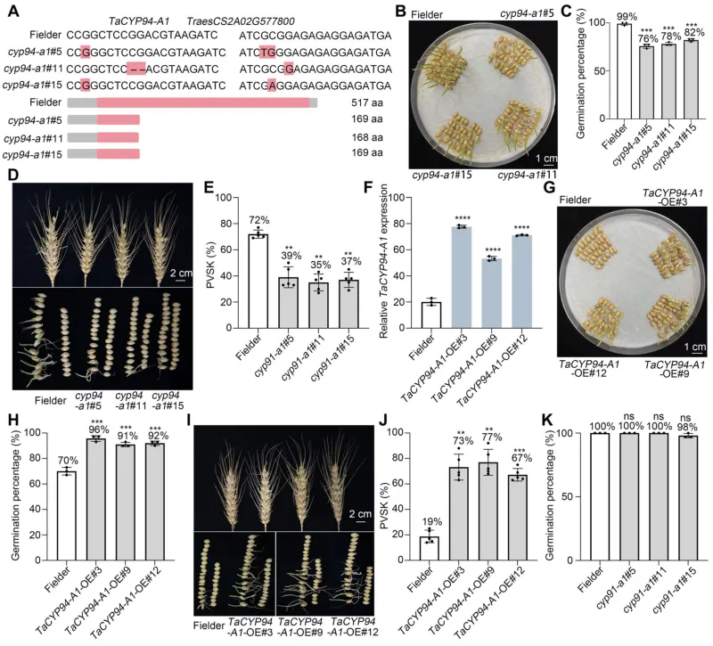 图4. TaCYP94-A1负调控小麦种子休眠。(A)通过CRISPR/Cas9技术获得的TaCYP94-A1序列突变。cyp94-a1#5和cyp94-a1#15均存在单个鸟嘌呤插入,导致移码突变,产生169个氨基酸的截短蛋白;cyp94-a1#11存在2个碱基缺失,导致移码突变,产生168个氨基酸的截短蛋白。图中红色方框表示细胞色素P450家族86的保守cd11064结构域。(B)cyp94-a1#5/11/15突变体与野生型费尔德(Fielder)种子在恒温培养箱(23℃±2℃)中吸胀5天后的萌发表型。(C)cyp94-a1#5/11/15突变体与费尔德种子的萌发率(GP)统计。实验设置3个生物学重复,每个重复对每个材料各检测30粒种子。数据以平均值±标准差表示(n=3),采用Student's t检验进行统计分析(***P<0.001)。(D)cyp94-a1#5/11/15突变体与费尔德穗及种子在人工气候箱(23℃±2℃)中吸胀5天后的萌发表型。(E)cyp94-a1#5/11/15突变体与费尔德穗吸胀5天后的可见发芽籽粒率(PVSK)统计。实验重复3次,每个重复对每个材料至少检测5个穗。数据以平均值±标准差表示(n=5),采用Student's t检验进行统计分析(**P<0.01)。(F)TaCYP94-A1过表达株系(TaCYP94-A1-OE#3/9/12)与费尔德中TaCYP94-A1的表达量分析。数据以平均值±标准差表示(n=3),采用Student's t检验进行统计分析(****P<0.0001)。(G)TaCYP94-A1-OE#3/9/12株系与费尔德种子在恒温培养箱(23℃±2℃)中吸胀3天后的萌发表型。(H)TaCYP94-A1-OE#3/9/12株系与费尔德种子的萌发率统计。实验设置3个生物学重复,每个重复检测30粒种子。数据以平均值±标准差表示(n=3),采用Student's t检验进行统计分析(***P<0.001)。(I)TaCYP94-A1-OE#3/9/12株系与费尔德穗及种子在人工气候箱(23℃±2℃)中吸胀3天后的萌发表型。(J)TaCYP94-A1-OE#3/9/12株系与费尔德穗吸胀3天后的可见发芽籽粒率统计。实验重复3次,每个重复至少检测5个穗。数据以平均值±标准差表示(n=3),采用Student's t检验进行统计分析(**P<0.01,***P<0.001)。(K)田间收获的cyp94-a1#5/11/15突变体与费尔德种子经室温贮藏5周后的萌发率。数据以平均值±标准差表示(n=3),“ns”表示差异不显著。