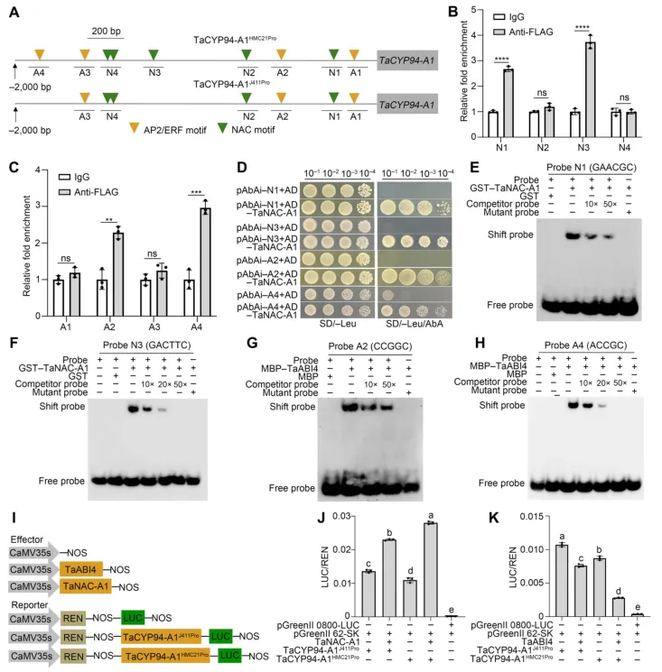 图5. TaABI4和TaNAC-A1直接结合TaCYP94-A1的启动子。(A)TaCYP94-A1启动子的结构示意图。绿色三角形表示预测的NAC转录因子结合基序;橙色三角形表示预测的AP2/ERF转录因子结合基序。标尺=200bp。(B、C)ChIP-qPCR分析结果显示,TaNAC-A1结合TaCYP94-A1启动子的N1和N3区域,TaABI4结合A2和A4区域。ChIP实验使用抗FLAG抗体和抗IgG抗体进行,相对富集倍数以阴性对照为基准(值=1)计算。数据以平均值±标准差表示(n=3),采用Student's t检验进行统计分析(**P<0.01,***P<0.001,****P<0.0001),“ns”表示差异不显著。(D)Y1H实验表明,TaNAC-A1和TaABI4均可结合TaCYP94-A1的两种启动子变体(TaCYP94-A1J411Pro和TaCYP94-A1HMC21Pro)。转化后的酵母细胞以10⁻¹稀释度接种到选择性培养基上。(E、F)EMSA结果显示,TaNAC-A1可高亲和力结合TaCYP94-A1HMC21Pro启动子中的GACTTC和GAACGC基序,以及TaCYP94-A1J411Pro和启动子中的GAACGC基序。“+”和“–”分别表示存在或不存在探针或蛋白。实验重复两次,结果一致。(G、H)EMSA结果显示,TaABI4可高亲和力结合TaCYP94-A1HMC21Pro启动子中的ACCGC和CCGGC基序,以及TaCYP94-A1J411Pro启动子中的CCGGC基序。“+”和“–”分别表示存在或不存在探针或蛋白。实验重复两次,结果一致。(I)双荧光素酶(dual-LUC)瞬时表达实验所用各载体的结构示意图。(J)dual-LUC瞬时表达实验显示,TaNAC-A1可激活由TaCYP94-A1J411Pro和TaCYP94-A1HMC21Pro启动子驱动的荧光素酶(LUC)报告基因表达,且对TaCYP94-A1HMC21Pro启动子的激活作用显著更强。数据以平均值±标准差表示(n=3),不同字母(a-e)表示经单因素方差分析(ANOVA)结合Tukey检验后存在显著差异(P<0.05)。(K)dual-LUC瞬时表达实验显示,TaABI4可抑制由TaCYP94-A1HMC21Pro和TaCYP94-A1J411Pro启动子驱动的LUC报告基因表达,且对TaCYP94-A1HMC21Pro启动子的抑制作用显著更强。数据以平均值±标准差表示(n=3),不同字母(a-e)表示经单因素方差分析(ANOVA)结合Tukey检验后存在显著差异(P<0.05)。