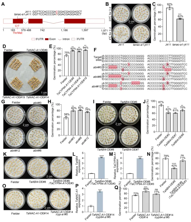 图6.小麦种子休眠中TaABI4和TaNAC-A1的功能及其与TaCYP94-A1的调控关系。(A)TaNAC-A1的EMS突变体tanac-a1-j411的序列变异情况。(B)tanac-a1-j411突变体和野生型京411(J411)种子吸胀3天后的表型;未萌发的种子经4℃处理3天,再置于培养箱中培养2天。(C)tanac-a1-j411和京411种子吸胀3天后的发芽率。数据以平均值±标准差表示(n=3),采用Student's t检验分析显著性(***P<0.001)。(D)TaNAC-A1过表达株系(TaNAC-A1-OE#9/14/19)和费尔德种子吸胀3天后的表型。(E)TaNAC-A1过表达株系(TaNAC-A1-OE#9/14/19)和费尔德种子的发芽率。数据以平均值±标准差表示(n=3),采用Student's t检验分析显著性(**P<0.01)。(F)TaABI4三突变体abi4#3/8/12中,基因TraesCS1A02G223400及其同源基因TraesCS1B02G236700、TraesCS1D02G225000的突变位点。(G)abi4#3/8/12突变体和费尔德种子吸胀3天后的表型。(H)abi4#3/8/12突变体和费尔德种子的发芽率。数据以平均值±标准差表示(n=3),采用Student's t检验分析显著性(**P<0.01)。(I)TaABI4过表达株系(TaABI4-OE#5/7/8)和费尔德种子吸胀5天后的表型。(J)TaABI4过表达株系(TaABI4-OE#5/7/8)和费尔德种子的发芽率。数据以平均值±标准差表示(n=3),采用Student's t检验分析显著性(**P<0.01,***P<0.0001)。(K)费尔德、TaABI4-OE#8以及TaABI4-OE#8/TaCYP94-A1-OE#3双过表达株系种子吸胀3天后的表型。(L、M)TaABI4-OE#8/TaCYP94-A1-OE#3双过表达株系中TaABI4和TaCYP94-A1的表达分析。数据以平均值±标准差表示(n=3),采用Student's t检验分析显著性(****P<0.0001)。(N)费尔德、TaABI4-OE#8以及TaABI4-OE#8/TaCYP94-A1-OE#3双过表达株系种子的发芽率。数据以平均值±标准差表示(n=3),采用Student's t检验分析显著性(****P<0.0001);ns表示无显著差异。(O)费尔德、TaNAC-A1-OE#14以及TaNAC-A1-OE#14/cyp94-a1#5株系种子吸胀3天后的表型。(P)TaNAC-A1-OE#14/cyp94-a1#5株系中TaNAC-A1的表达分析。数据以平均值±标准差表示(n=3),采用Student's t检验分析显著性(****P<0.0001)。(Q)费尔德、TaNAC-A1-OE#14以及TaNAC-A1-OE#14/cyp94-a1#5株系种子的发芽率。数据以平均值±标准差表示(n=3),采用Student's t检验分析显著性(***P<0.001);ns表示无显著差异。