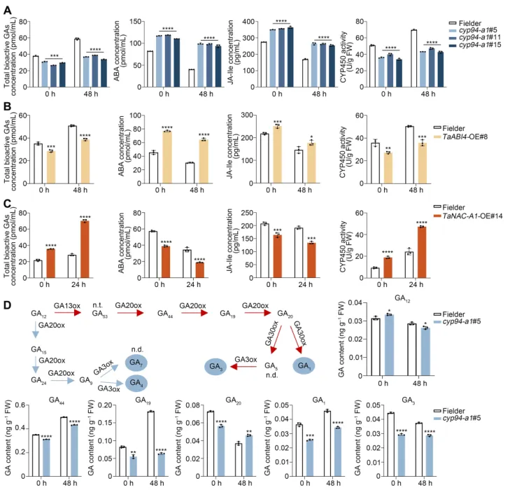 图7.转基因小麦和野生型费尔德(Fielder)种子中的植物激素含量与细胞色素P450酶活性。(A)TaCYP94-A1基因CRISPR/Cas9编辑株系与费尔德种子的脱落酸(ABA)、赤霉素(GA,活性赤霉素)、茉莉酸-异亮氨酸结合物(JA-Ile)含量及细胞色素P450酶活性。数据以平均值±标准差表示(n=3),采用Student's t检验分析显著性(***P<0.001,****P<0.0001)。(B)TaABI4过表达株系与费尔德种子的脱落酸(ABA)、赤霉素(GA)、茉莉酸-异亮氨酸结合物(JA-Ile)含量及细胞色素P450酶活性。数据以平均值±标准差表示(n=3),采用Student's t检验分析显著性(*P<0.05,**P<0.01,***P<0.001,****P<0.0001)。(C)TaNAC-A1过表达株系与费尔德种子的脱落酸(ABA)、赤霉素(GA)、茉莉酸-异亮氨酸结合物(JA-Ile)含量及细胞色素P450酶活性。数据以平均值±标准差表示(n=3),采用Student's t检验分析显著性(***P<0.001,****P<0.0001)。(D)赤霉素(GA)生物合成途径示意图,及cyp94-a1#5突变体与费尔德种子吸胀0h和48h后指定GA代谢物的含量。FW=鲜重;n.d.=未检测到;n.t.=未检测。蓝色箭头代表非13-羟化途径(GA15、GA24、GA9、GA4、GA7);红色箭头代表早期13-羟化途径(GA44、GA19、GA20、GA5、GA1和