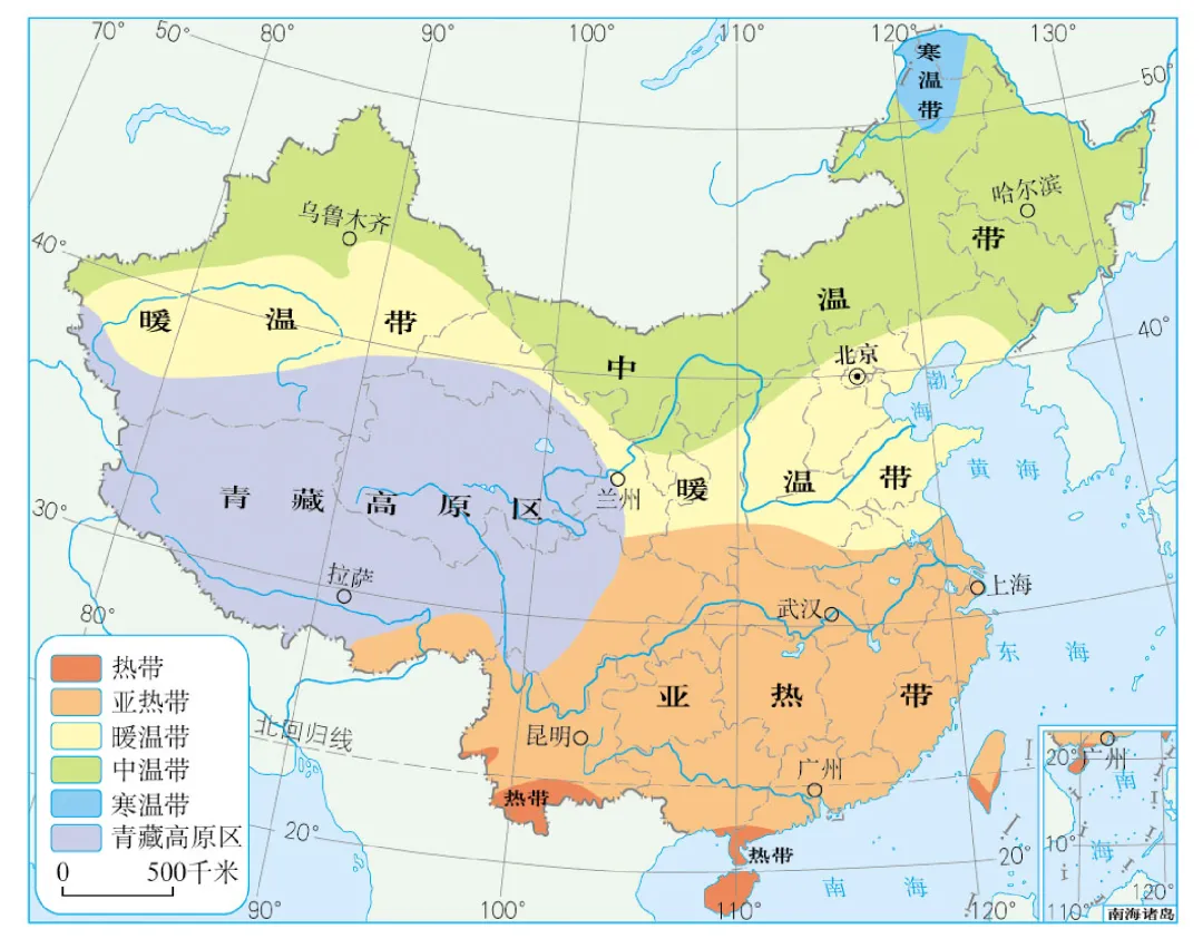 积温的多少决定了农作物的生长期的长短,能直接影响作物长势和生长季节。根据≥10 ℃积温的多少,我国东部自北向南可以分为五个温度带:寒温带、中温带、暖温带、亚热带和热带,积温越来越多,农作物的生长期也越来越长;除此之外,还包含一个青藏高原区。