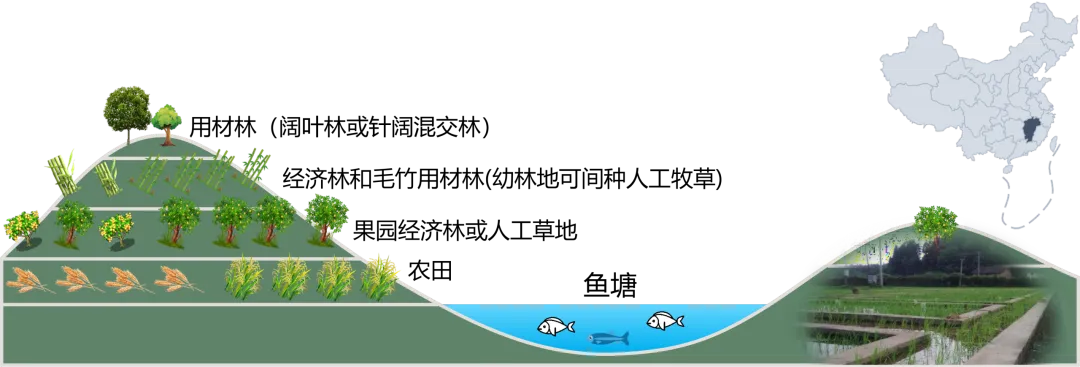 江西千烟洲——“丘上林草丘间塘,缓坡沟谷果鱼粮”:属于丘陵山地立体综合利用模式的一种。针对地形变化大,气候垂直变化明显的特点;充分利用当地的“立体气候”,依据不同生物的生活习性和空间的多层次性,合理布局农、林、牧、渔、副业的农业模式,是一种建立在生态良性循环基础上的生态农业。