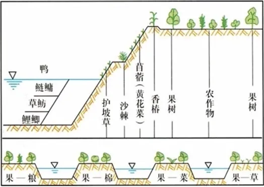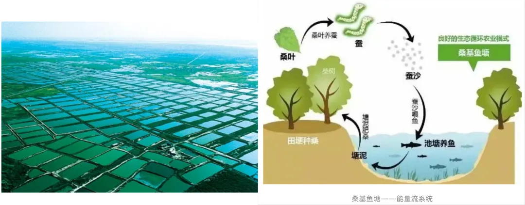 珠江三角洲基塘农业:属于低洼平坦的冲积平原地区土地综合利用模式的典型。针对地势低洼、降水丰沛、易发洪涝灾害的特点,挖洼地为鱼塘,将泥土堆砌在鱼塘四周成塘基,塘中养鱼,基上种桑、甘蔗、果树和花卉,形成水陆互养的基塘农业人工生态系统。