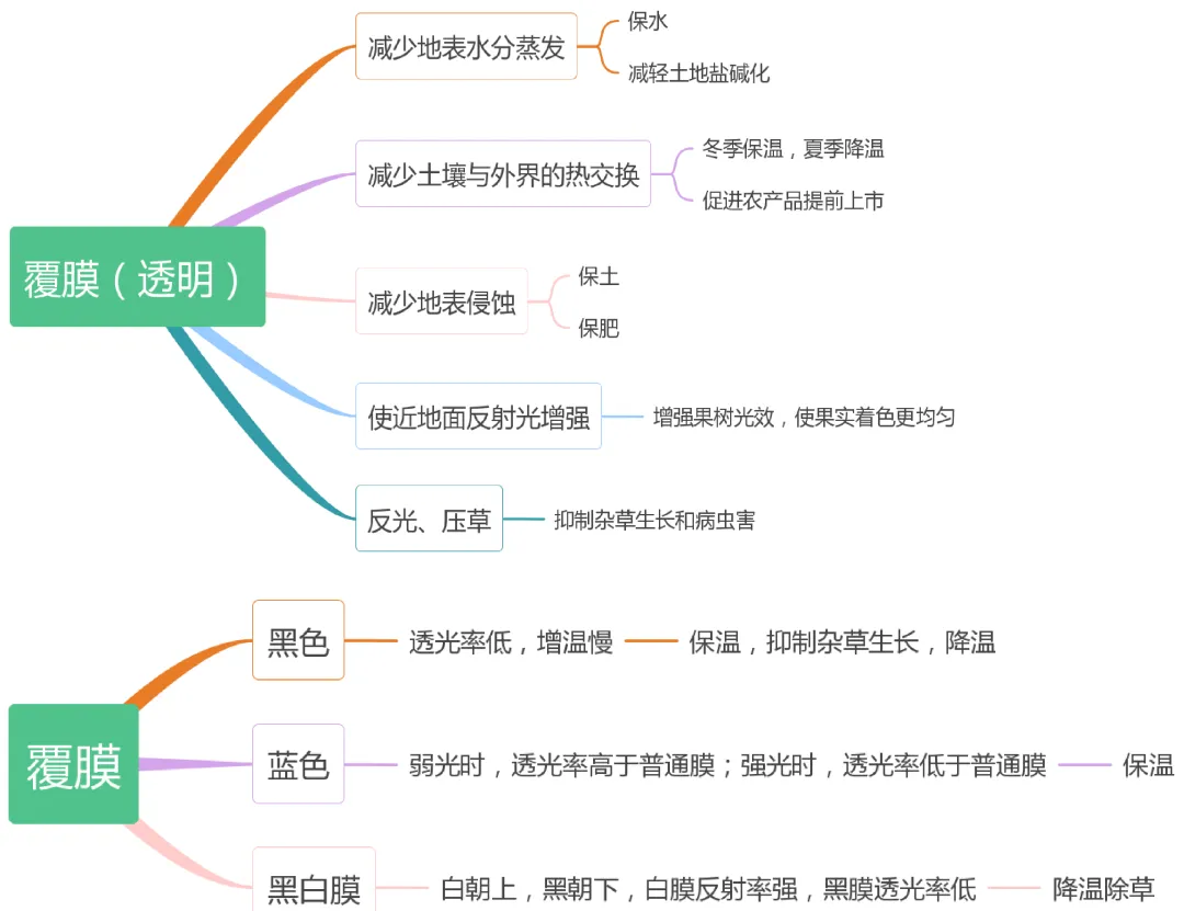 - 覆膜类(透明膜和不透明膜):地膜覆盖在不地区使用的时间是有差异的,如华北地区主要在春季,西北地区在夏季,需根据农业发展的要求具体分析;地膜覆盖容易被大风掀起或撕裂;难以自然降解,造成环境污染;进入到土壤中会阻碍土壤的水肥运动;阻碍植物根系的生长。