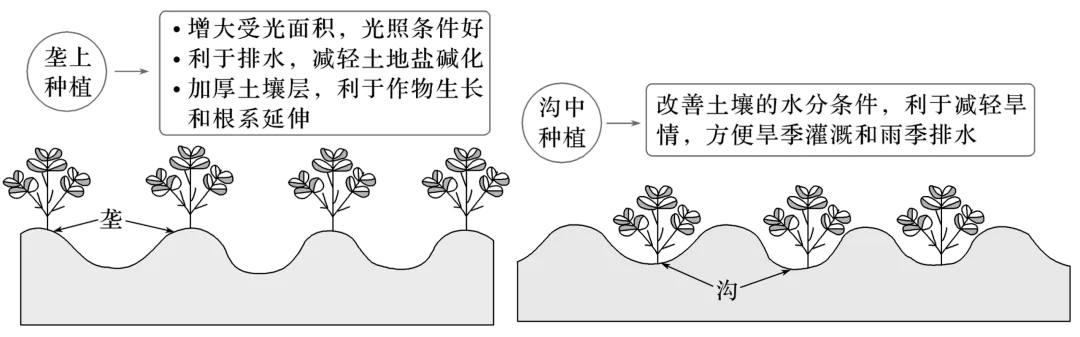 黄淮海平原的鱼塘-台田模式:黄淮海平原地势低洼,渍涝严重,土壤盐碱化严重。开挖鱼塘,积水发展渔业;同时,挖出来的土堆积到田面抬高地势,在台田里种粮、果、棉和饲料作物,又能降低台田地下水位,利于地表水下渗,从而降低台田地表的盐度,以达到改良华北地区的中低产田的效果。