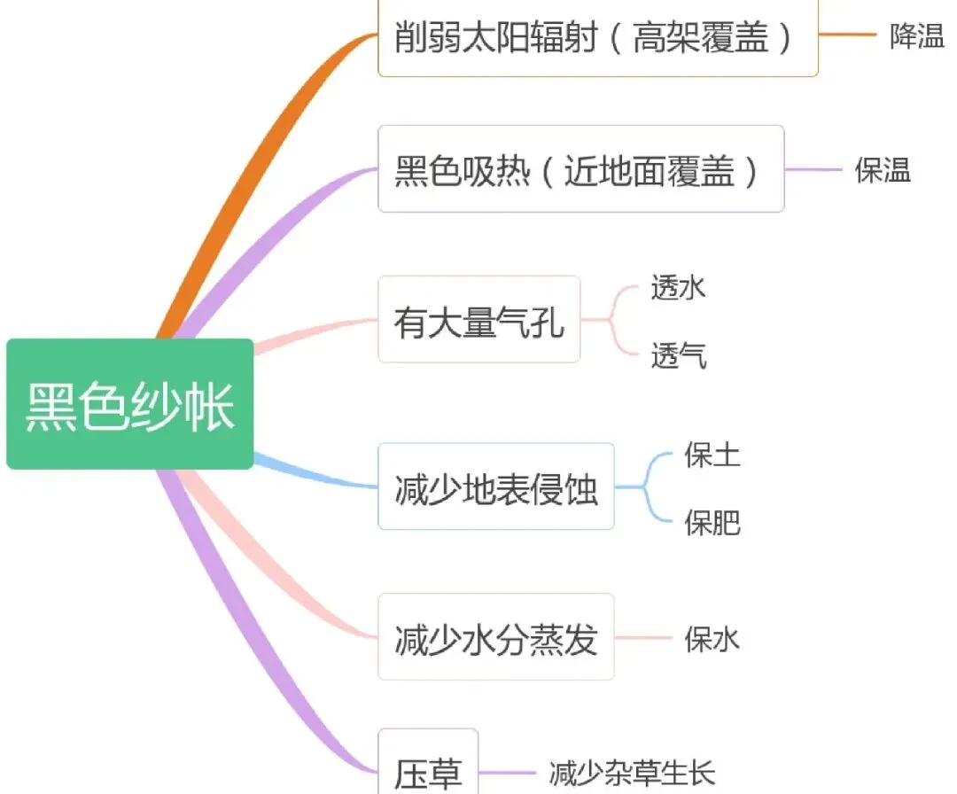 - 纱帐类:黑色纱帐可以直接覆盖在地面上,也可以像大棚一样架高覆盖,其使用时间较多在夏季。