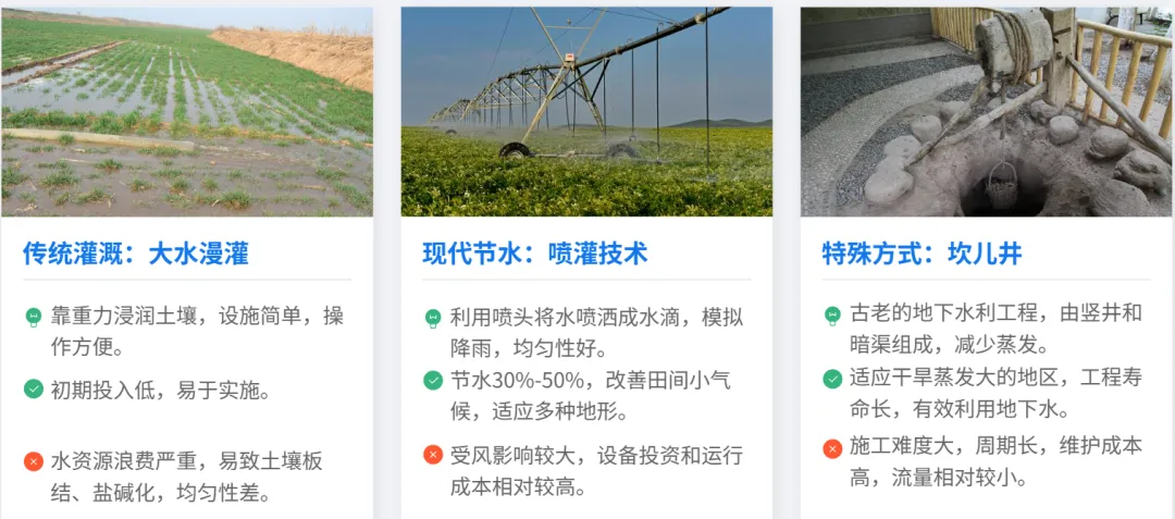 灌溉技术:指通过人为手段,利用水利工程设施,将水输送到农田,以补充作物生长所需水分的技术措施。其核心目的是调节农田水分状况,改善农业生产条件,保证作物高产稳产。