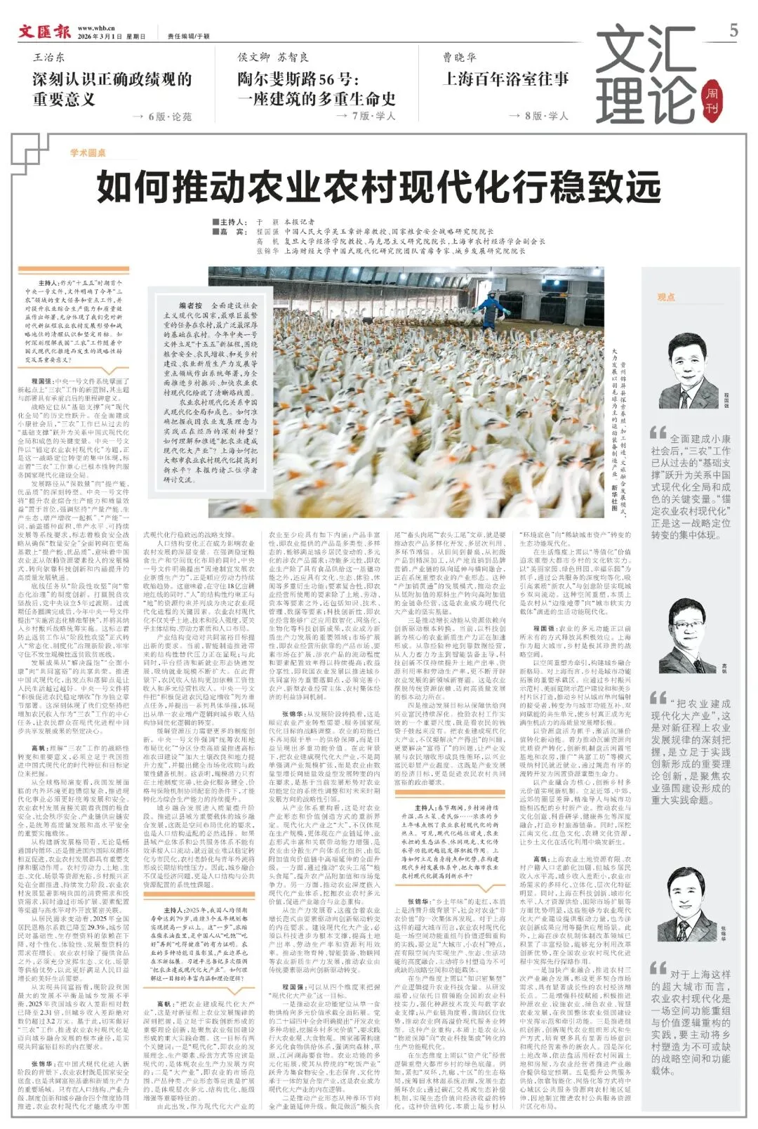 主持人:作为“十五五”时期首个中央一号文件,文件明确了今年“三农”领域的重大任务和重点工作,并对提升农业综合生产能力和质量效益作出部署,充分体现了我们党对新时代新征程农业农村发展形势和战略地位的清醒认识和坚定目标。如何深刻理解我国“三农”工作随着中国式现代化推进而发生的战略性转变及其重要意义?程国强:中央一号文件系统擘画了新起点上“三农”工作的新蓝图,其主题与部署具有承前启后的里程碑意义。战略定位从“基础支撑”向“现代化全局”的历史性跃升。在全面建成小康社会后,“三农”工作已从过去的“基础支撑”跃升为关系中国式现代化全局和成色的关键变量。中央一号文件以“锚定农业农村现代化”为题,正是这一战略定位转变的集中体现,标志着“三农”工作重心已根本性转向服务国家现代化建设全局。发展路径从“保数量”向“提产能、优品质”的深刻转型。中央一号文件将“提升农业综合生产能力和质量效益”置于首位,强调坚持“产量产能、生产生态、增产增收一起抓”。“产能”一词,涵盖播种面积、单产水平、可持续发展等系统要求,标志着粮食安全战略从确保“数量安全”全面转向在更高基数上“提产能、优品质”,意味着中国农业正从依赖资源要素投入的发展模式,转向依靠科技创新和内涵提升的高质量发展轨道。底线任务从“阶段性攻坚”向“常态化治理”的制度创新。打赢脱贫攻坚战后,党中央设立5年过渡期。过渡期任务圆满完成后,今年中央一号文件提出“实施常态化精准帮扶”,并将其纳入乡村振兴战略统筹实施。这标志着防止返贫工作从“阶段性攻坚”正式转入“常态化、制度化”治理新阶段,牢牢守住不发生规模性返贫致贫底线。发展成果从“解决温饱”“全面小康”向“共同富裕”的共享共荣。推进中国式现代化,出发点和落脚点是让人民生活越过越好。中央一号文件将“积极促进农民稳定增收”作为独立章节部署。这深刻体现了我们党坚持把增加农民收入作为“三农”工作的中心任务,让农民群众在现代化进程中同步共享发展成果的坚定决心。高帆:理解“三农”工作的战略性转变和重要意义,必须立足于我国推进中国式现代化的时代特征和目标定位来把握。从全球格局演变看,我国发展面临的内外环境更趋错综复杂,推进现代化事业必须更好统筹发展和安全。农业农村发展直接关联着我国的粮食安全、社会秩序安全、产业链供应链安全,是统筹高质量发展和高水平安全的重要实施载体。从构建新发展格局看,无论是畅通国内循环、还是推进国内国际双循环相互促进,农业农村发展都具有重要支撑和驱动作用。农村劳动力、土地、生态、文化、场景等资源充裕,乡村振兴正处在全面推进、持续发力阶段,农业农村发展显著影响我国的消费需求和投资需求,同时通过市场扩展、要素配置等渠道与高水平对外开放紧密关联。从居民需求变动看,2025年全国居民恩格尔系数已降至29.3%,城乡居民对基础性、生存型资料的依赖在下降,对个性化、体验性、发展型资料的需求在增长。农业农村除了提供食品之外,必须充分发挥生态、文化、场景等供给优势,以此更好满足人民日益增长的美好生活需要。从实现共同富裕看,现阶段我国最大的发展不平衡是城乡发展不平衡,2025年我国城乡收入差距相对数已降至2.31倍,但城乡收入差距绝对数仍超过3.2万元。基于此,切实做好“三农”工作、推进农业农村现代化是迈向城乡融合发展的根本途径,是实现共同富裕目标的内在要求。张锦华:在中国式现代化进入新阶段的背景下,农业农村既是国家安全底盘,也是共同富裕基础和新质生产力的重要场域。只有在人口结构、产业升级、制度创新和城乡融合四个维度协同推进,农业农村现代化才能成为中国式现代化行稳致远的战略支撑。人口结构变化正在成为影响农业农村发展的深层变量。在强调稳定粮食生产和空间优化布局的同时,中央一号文件明确提出“因地制宜发展农业新质生产力”,正是顺应劳动力持续收缩趋势。这意味着,在守住18亿亩耕地红线的同时,“人”的结构性约束正与“地”的资源约束并列成为决定农业现代化进程的关键因素。农业农村现代化不仅关乎土地、技术和投入强度,更关乎主体结构、劳动力素质和人口布局。产业结构变动对共同富裕目标提出新的要求。当前,智能制造推进带来的结构性替代压力正在显现;与此同时,平台经济和新就业形态快速发展,吸纳就业规模不断扩大。在此背景下,农民收入结构更加依赖工资性收入和多元经营性收入。中央一号文件把“积极促进农民稳定增收”列为重点任务,并提出一系列具体举措,体现出从单一农业增产逻辑向城乡收入结构协同优化逻辑的转变。缓解资源压力需要更多的制度创新。中央一号文件强调“统筹农用地布局优化”“分区分类高质量推进高标准农田建设”“加大土壤改良和地力提升力度”,并提出健全市场化收购与政策性储备机制。这表明,规模潜力只有在土地制度完善、社会化服务健全、价格与保险机制协同配套的条件下,才能转化为综合生产能力的持续提升。城乡融合发展进入质量提升阶段。推进以县域为重要载体的城乡融合发展,这既是空间布局优化的要求,也是人口结构适配的必然选择。如