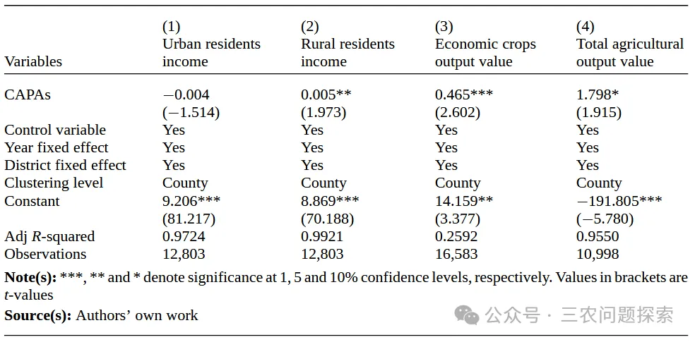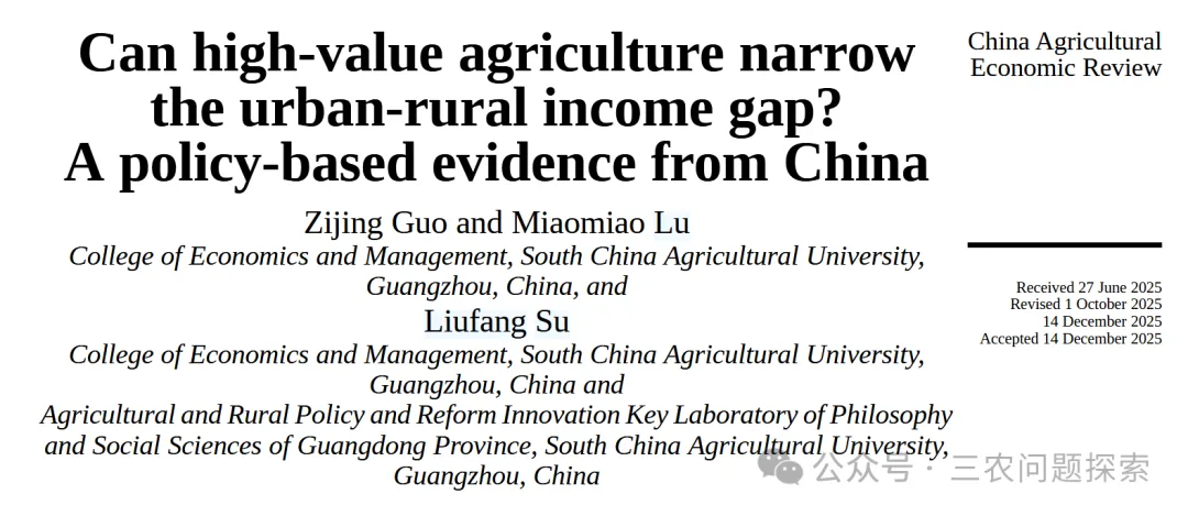 最后,高价值农业可以通过升级农业经营主体来缩小城乡收入差距。与传统农业相比,高价值农业与更多样化和现代化的组织形式相关联,这些形式有利于规模化经营和专业化生产(Huang和Liang,2018;Luo等,2025)。高价值农业通过促进合作社和农业企业等新型管理主体的进入,推动农业生产组织化(Jin等,2024;Luo等,2025)。这些主体推广订单农业和数字农业等生产模式,进一步加强了农产品与市场的联系(Narayanan,2014;Cramer等,2022)。通过促进大规模和专业化生产,农民可以摆脱分散的自雇经营,降低交易和运营风险,并通过参与合作社或农业企业以及改善市场准入,获得更稳定的收入(Shiferaw等,2011)。此外,通过将农业价值链延伸至加工、物流和营销环节,新型经营主体创造了额外的就业机会,共同促进收入增长和就业稳定,从而有助于缩小城乡收入差距(Barrett等,2022;Reardon等,2019)。基于此理解,我们提出以下最终假设: