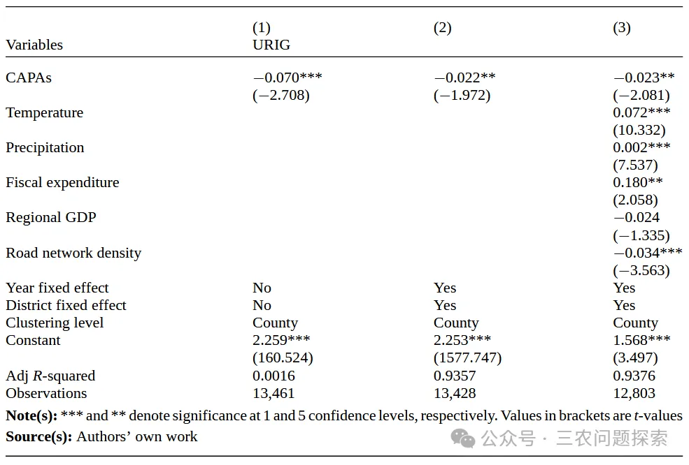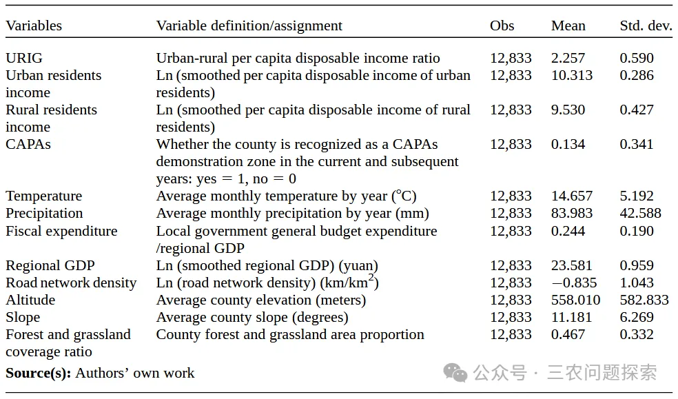 参照Yu and Lu(2021)和Gao et al.(2014)的研究,本研究控制了其他可能影响特色农产品优势区和城乡居民收入比的因素,包括温度、降水、财政支出、地区GDP和道路网络密度。鉴于特色农产品优势区的认定特别强调生态条件和资源禀赋,我们进一步采用倾向得分匹配 - 双重差分法(PSM-DID)以确保结果的稳健性。在匹配过程中,借鉴《特色农产品优势区建设规划纲要》,纳入了反映县级地形和资源特征的额外协变量,如海拔、坡度和森林草地覆盖率。