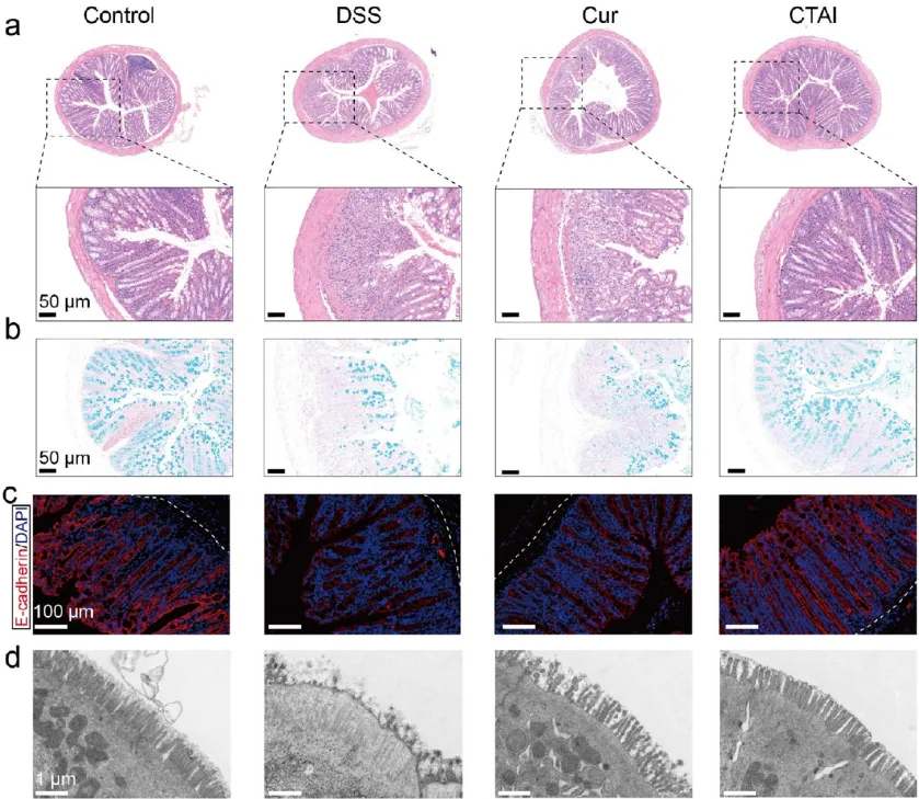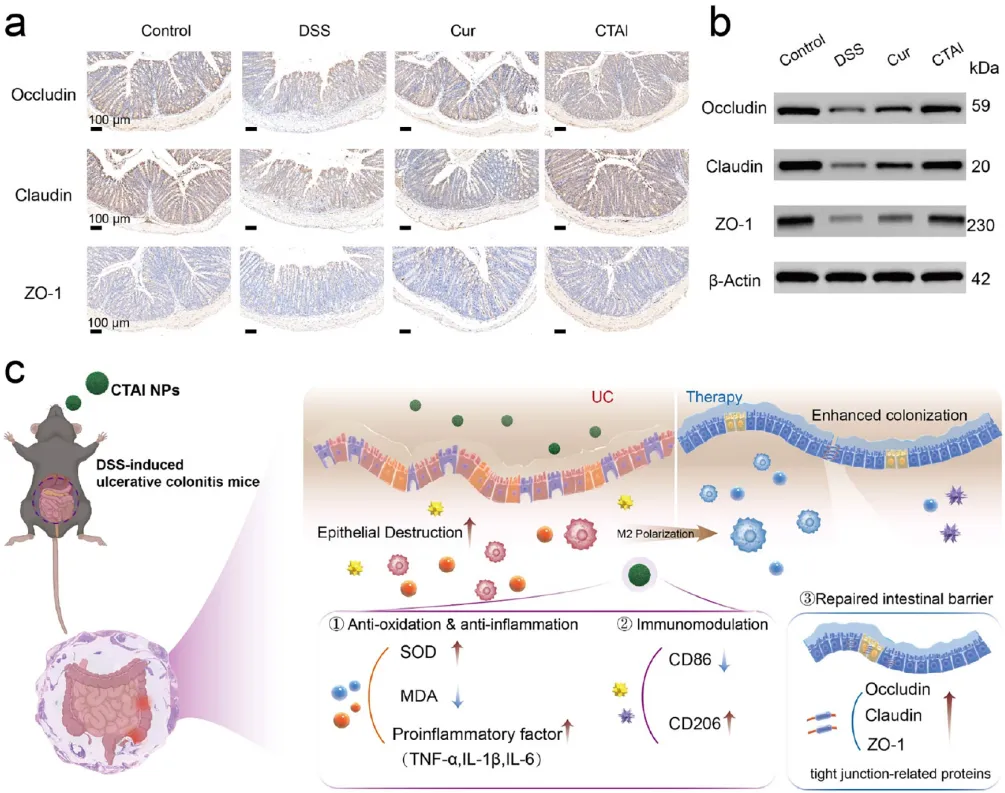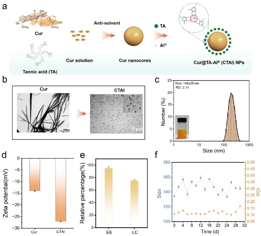 天然生物活性化合物在溃疡性结肠炎(UC)的治疗中展现出良好的前景,但其较差的生物利用度和疗效限制了应用。为此,研究团队提出一种称为“天然生物活性化合物-纳米技术-多维度调控”的跨学科策略,通过自组装方法开发了一种口服、生物相容的纳米粒子系统(CTAl NPs)。姜黄素(Cur)通过氢键、π–π堆积和配位作用,成功被包裹在单宁酸(TA)与Al³⁺形成的配位网络中。所制备的CTAl NPs通过三种协同机制发挥治疗作用,包括强大的抗炎和抗氧化活性、免疫稳态的恢复以及肠黏膜屏障的增强。这些效应源于各组分的互补功能:TA–Al³⁺配位赋予了黏膜黏附和免疫调节能力,而Cur则提供其固有的抗炎活性。该三元复合系统展现出增强的疗效,为UC治疗提供了一种简便、安全且高效的策略,并为治疗炎症相关疾病提供了更广泛的启示。