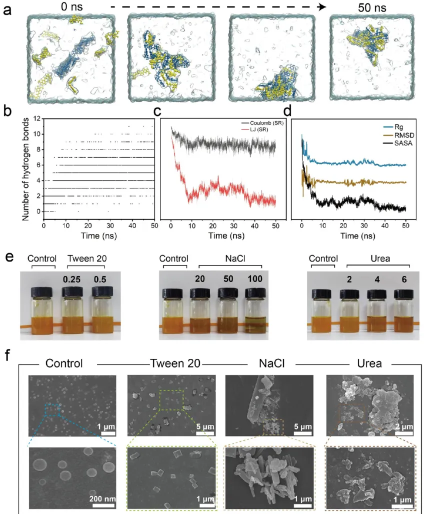 为了验证哪种力是关键,他们用了“拆台三件套”:尿素破坏氢键,吐温20干扰疏水作用,氯化钠屏蔽静电。结果加入尿素后溶液立刻变浑浊,颗粒散架(图3e-f),证明氢键是C位作用力!