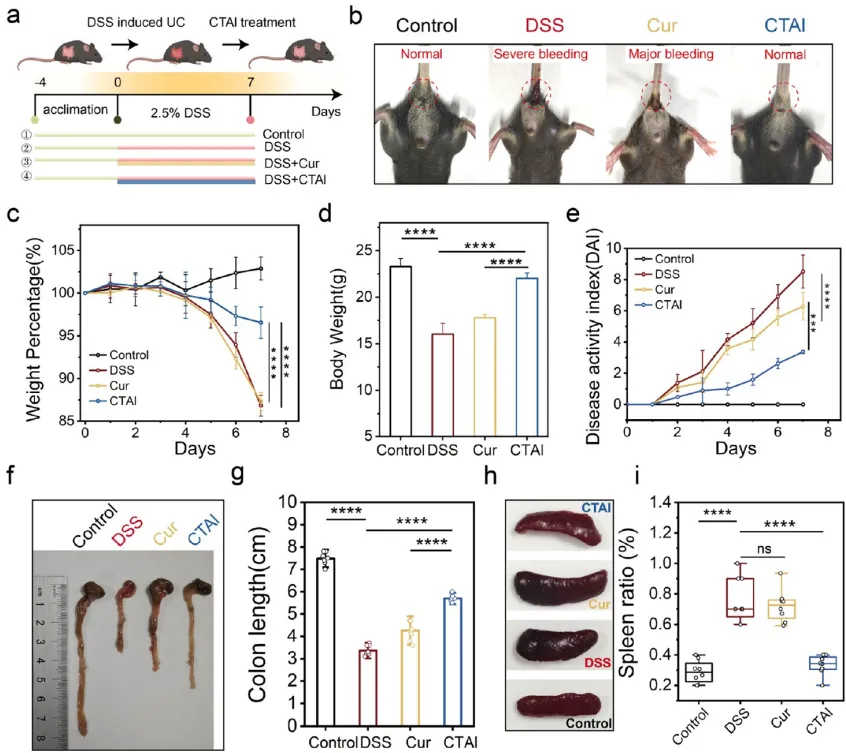 重头戏来了!研究人员给小鼠喝DSS水(模拟人类肠炎),让它们便血、体重暴跌、结肠缩短(惨兮兮)。然后分成四组:健康组、病号组、吃纯姜黄素组、吃纳米颗粒组。