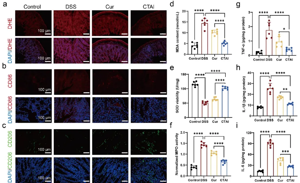 抗炎:肿瘤坏死因子(TNF-α)、白介素(IL-1β、IL-6)等炎症因子被压到接近正常水平(图7d-i)。