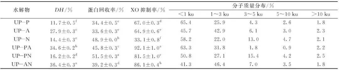 不同蛋白酶水解裙带菜蛋白的水解度、蛋白回收率、XO抑制率和分子质量分布的结果如表1。裙带菜蛋白不具有XO抑制活性,不同蛋白酶水解裙带菜蛋白有效释放XO抑制活性序列,水解物的XO抑制率具有显著性差异(PP