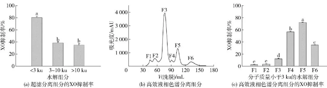 图(a)中测定XO抑制率的蛋白质量浓度为1 mg/mL,图(c)中测定XO抑制率的蛋白质量浓度为0.25 mg/mL。不同小写字母表示水解物组分间XO抑制率差异显著(P<0.05)。
