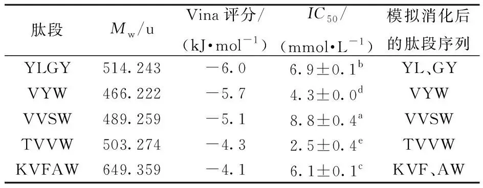 表2 裙带菜蛋白XO抑制肽的分子质量、Vina评分、抑制活性和消化稳定性