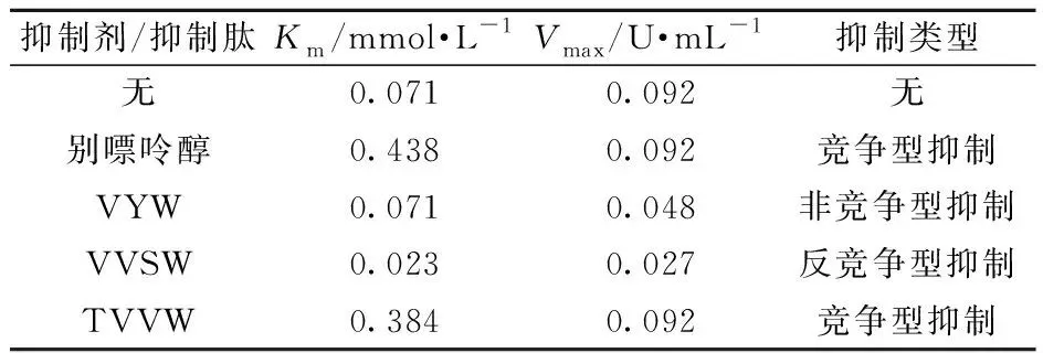 Tab.3 Effect and inhibition types of allopurinol, VYW, VVSW, and TVVW on Km and Vmax of XO catalyzed reactions
