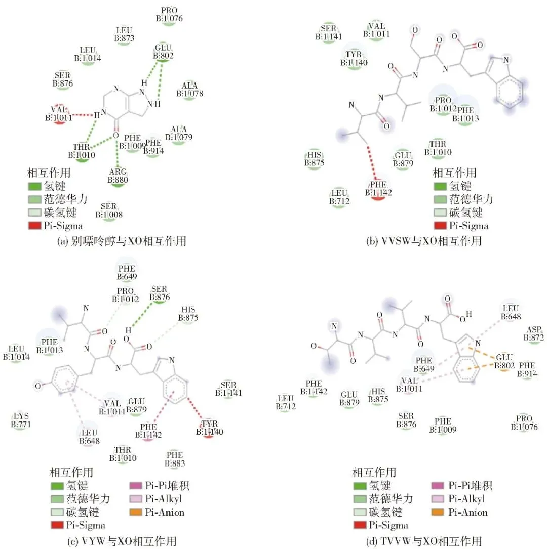 将别嘌呤醇、VVSW、VYW和TVVW与XO进行半柔性对接,在分子水平上,分析VVSW、VYW和TVVW与XO的相互作用机制,分析结果见图2。XO的关键活性中心是一个由氨基酸残基(Phe649、Glu802、His875、Arg880、Glu879、Thr1010、Val1011、Pro1012、Phe1013、Phe1142、Glu1261等)包围的钼结构域,其中Glu802、Arg880和Glu1261是激活该活性结构域的关键残基[25]。由图2(a)可知,别嘌呤醇与XO活性中心的Glu802、Arg880和Thr1010残基通过5个氢键结合,与Val1011残基发生Pi-Sigma相互作用。正如Li等[3]研究报道,别嘌呤醇与XO表现出很强的结合状态。由图2(b)和图2(c)可知,VVSW和VYW分别与Phe1142和Tyr1140残基发生Pi-Sigma相互作用,但VYW上的色氨酸和酪氨酸还与XO活性中心及以外的Phe1142、Val1011、Leu648、Ser876、Pro1012和His875残基通过Pi-Pi堆积作用、Pi-Alkyl作用和氢键结合。XO活性口袋接近蛋白表面,抑制序列部分留在活性口袋外侧,阻止黄嘌呤进入活性中心,抑制XO的催化反应[26]。因此,VYW的XO抑制活性(IC50值为4.3 mmol/L)优于VVSW的XO抑制活性(IC50值为8.8 mmol/L)。由图2(d)可知,TVVW上的色氨酸分别与XO活性中心的Glu802和Val1011残基发生Pi-阴离子和Pi-Alkyl相互作用,从而竞争型抑制XO的催化活性。本研究表明,VYW和TVVW上的色氨酸通过与XO活性中心及以外的位点发生Pi-Sigma、Pi-Pi堆积和Pi-Alkyl相互作用,抑制XO活性。