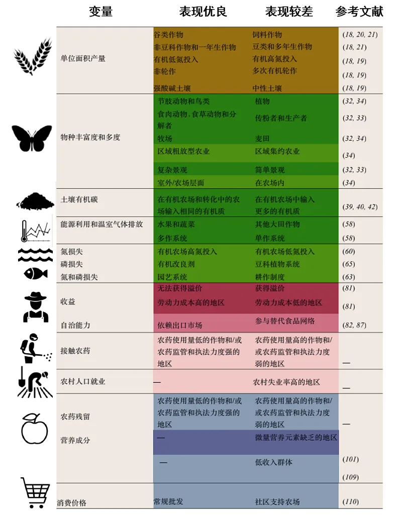 (1)生物多样性:评估农业系统对生物多样性的影响必须考虑有机和常规农业在产量上的差距,应在生物多样性效益和产量之间进行权衡。