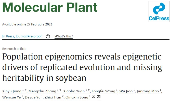 近日,南京农业大学宋庆鑫教授团队在植物学顶级期刊《Molecular Plant》上在线发表了一项突破性成果。该研究通过群体表观基因组学视角,深入剖析了DNA甲基化在大豆从野生状态到人工驯化、再到地理扩散及区域改良这一漫长演化历程中的动态演变规律。研究不仅揭示了DNA甲基化如何驱动大豆在由南向北的自然扩散与人工引种过程中实现开花时间提前的“趋同进化”,还阐明了其在解释农艺性状中长期存在的“丢失遗传力”问题上所扮演的关键角色。