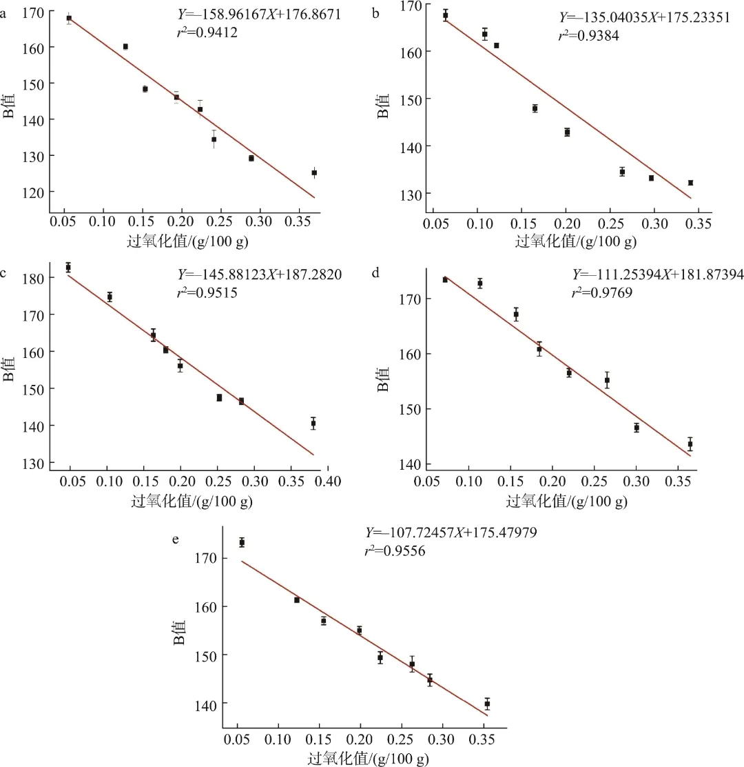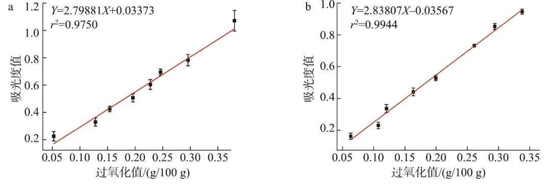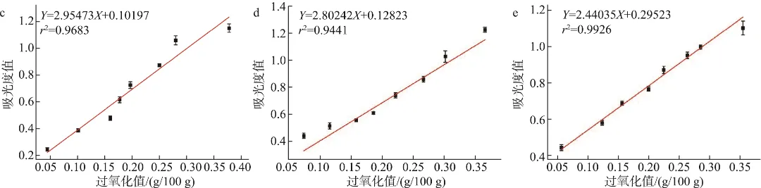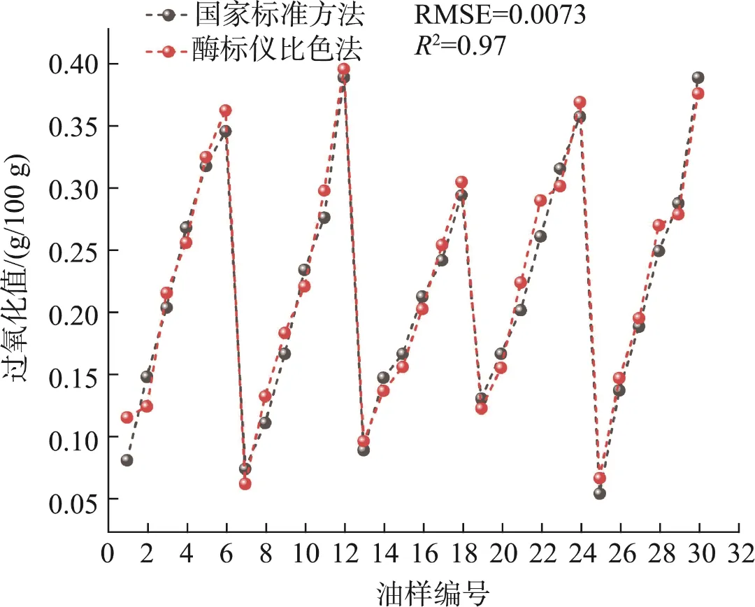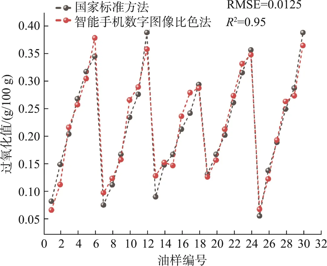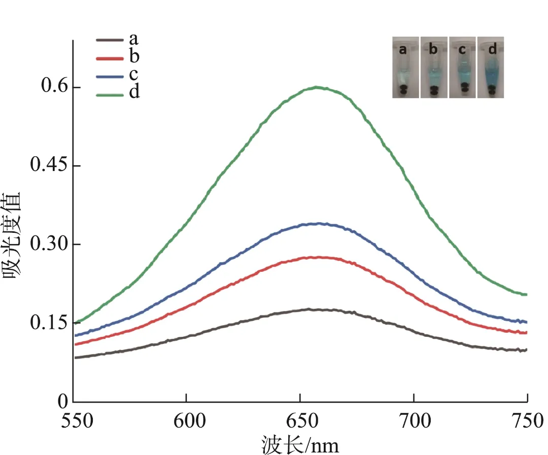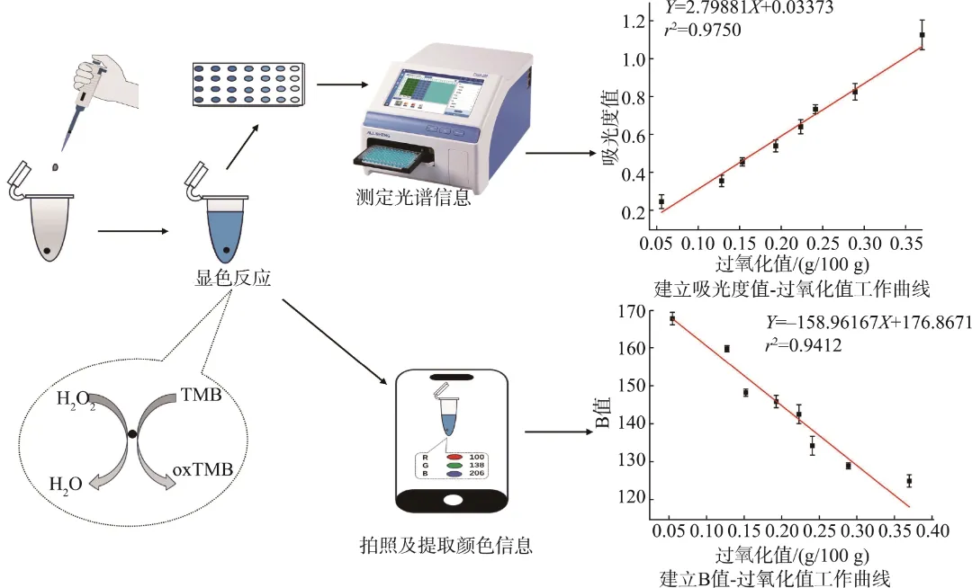 植物性食用油是人类膳食的重要组成部分, 可为人体提供所需的能量和营养物质。然而, 由于其富含不饱和脂肪酸, 易受光照、金属离子、高温及水分等因素的影响, 引发氧化酸败并产生异味及有害物质。过氧化值(peroxide value, POV)作为评价油脂氧化程度的重要指标。根据我国GB 2716—2018《食品安全国家标准 植物油》的规定, 植物性食用油的POV不应超过0.25 g/100 g。目前, 国内外对植物性食用油POV的检测方法主要有碘量法、光谱法、色谱法及电化学分析法等。然而, 传统的碘量法需使用有毒试剂且重复性较差; 光谱法、色谱法、电化学法则存在耗时长、操作复杂及需依赖专业仪器等局限性, 限制了其日常应用。相比之下, 比色法具有可视化、快速、灵敏度高等优势, 其通常结合酶标仪、紫外分光光度计等工具对目标物进行分析。与此同时, 智能手机作为一种便携式检测辅助工具, 近些年在食品、生物、医药及环境等领域得到了广泛应用。基于智能手机的数字图像比色检测技术是利用三原色(red, green, blue, RGB)原理, 通过采集图像颜色信息的空间数值后建立其与目标物含量的定量关系, 以实现对目标物的检测。比色法与智能手机相结合不仅可节约检测时间和经济成本, 还可实现现场的即时检测。但是, 目前将Fe3O4纳米酶与比色法及智能手机相结合用于检测食用油POV的报道较少。
