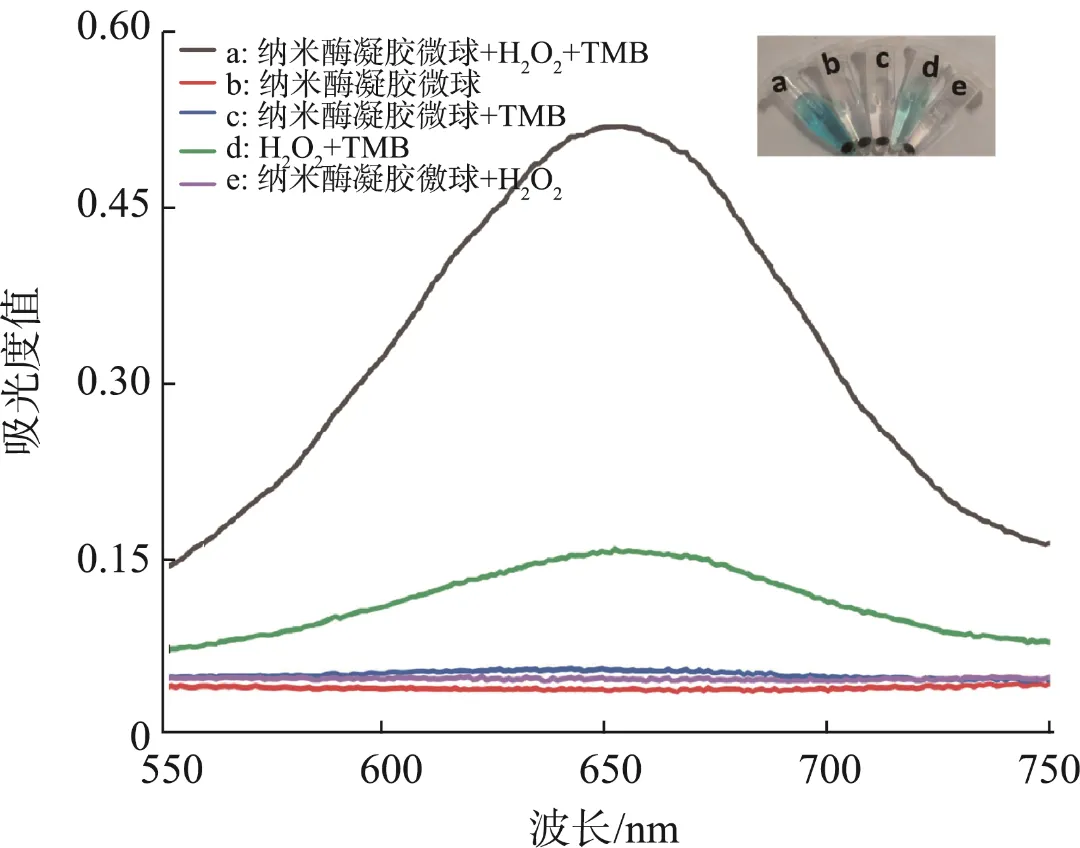 鉴于此, 本研究以海藻酸钠(sodium alginate, SA)为载体, 采用化学共沉淀法和离子交联技术制备了具有类过氧化物酶活性的Fe3O4@SA纳米酶凝胶微球(以下简称: 纳米酶凝胶微球), 并构建了检测植物性食用油POV的比色传感体系(图1)。该体系中的纳米酶凝胶微球可催化植物性食用油中的过氧化物形成羟基自由基, 使得3,3’,5,5’-四甲基联苯胺(3,3’,5,5’-tetramethylbenzidine, TMB)变成蓝色氧化产物3,3’,5,5’-四甲基联苯二亚胺(3,3’,5,5’-tetramethylbenzidine diimine, oxTMB), 产生肉眼可见的颜色变化。利用酶标仪和智能手机采集颜色信息, 结合吸光度值和RGB分析进行数字化处理, 建立基于酶标仪比色法和智能手机数字图像比色法的POV快速检测方法。本研究基于纳米酶凝胶微球构建的比色检测方法具有检测所需时间短、经济成本低、操作简便, 无需借助大型实验仪器设备即可快速实现对植物性食用油 POV 的即时检测, 可为食用油的质量控制提供新技术。