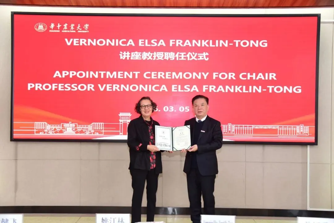 2026年3月5日,英国皇家科学院院士Vernonica Elsa Franklin-Tong讲座教授聘任仪式在华中农业大学园林南楼204会议室举行。校党委书记姚江林出席聘任仪式。国际合作与交流部、人力资源部、园艺林学学院、果蔬园艺作物种质创新与利用全国重点实验室相关负责人以及师生代表参加聘任仪式,会议由园艺林学学院院长、果蔬园艺作物种质创新与利用全国重点实验室主任徐强主持。