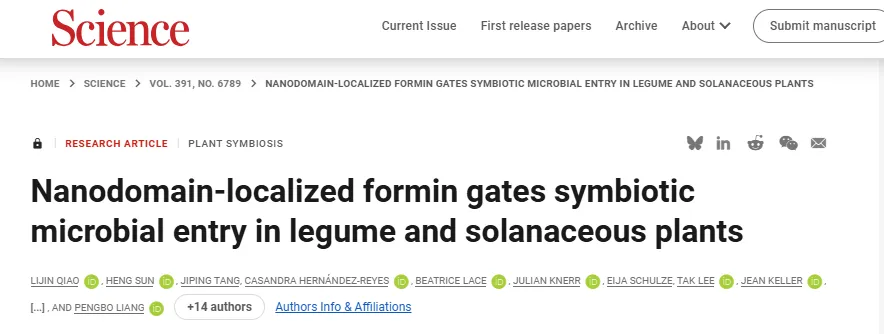 北京时间2026年3月6日,中国农业大学生物学院梁鹏博团队在《科学》(Science)发表了题为“Nanodomain-localized formin gates symbiotic microbial entry in legume and solanaceous plants”的研究论文。