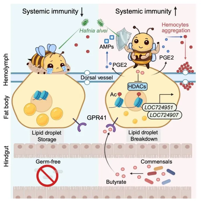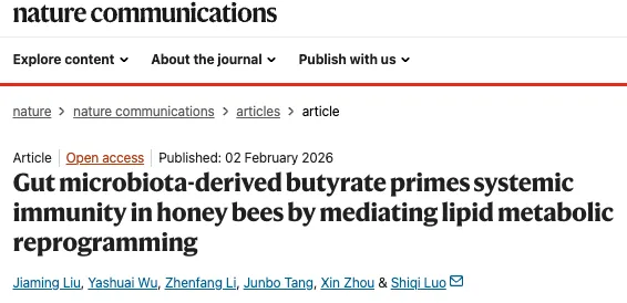 原文链接:Liu, J., Wu, Y., Li, Z., Tang, J., Zhou, X., Luo, S. Gut microbiota-derived butyrate primes systemic immunity in honey bees by mediating lipid metabolic reprogramming. Nature Communications (2026). https://doi.org/10.1038/s41467-026-69073-0