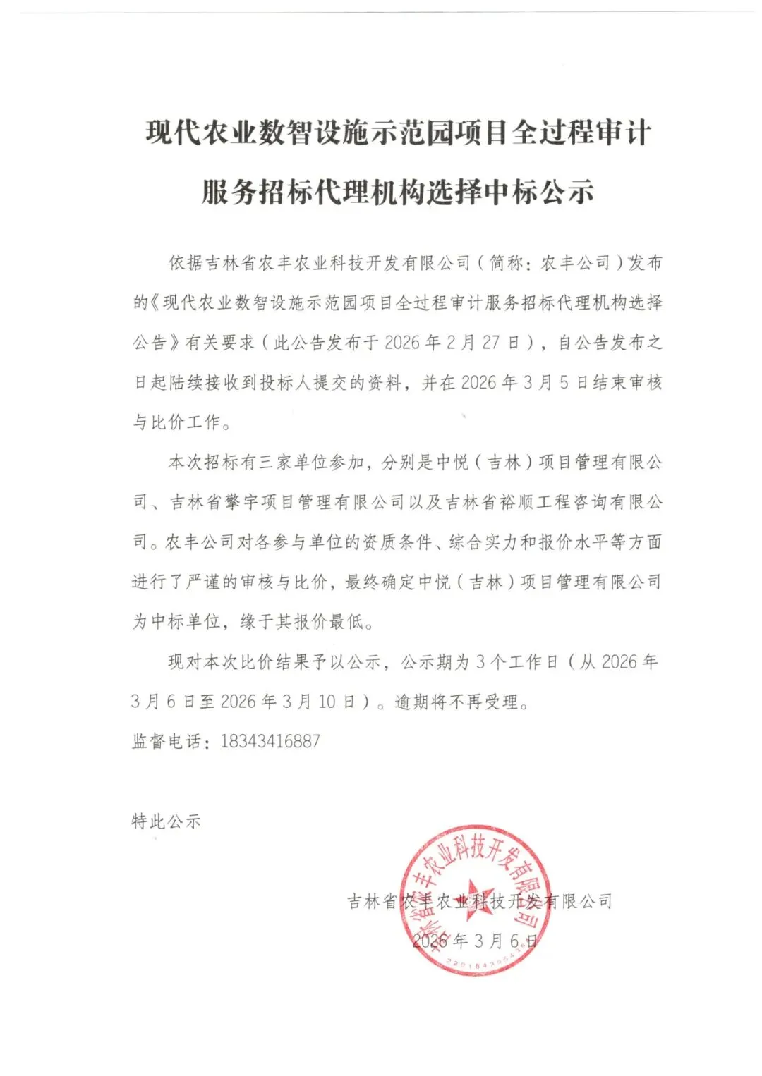 现代农业数智设施示范园项目全过程审计服务招标代理机构选择中标公示