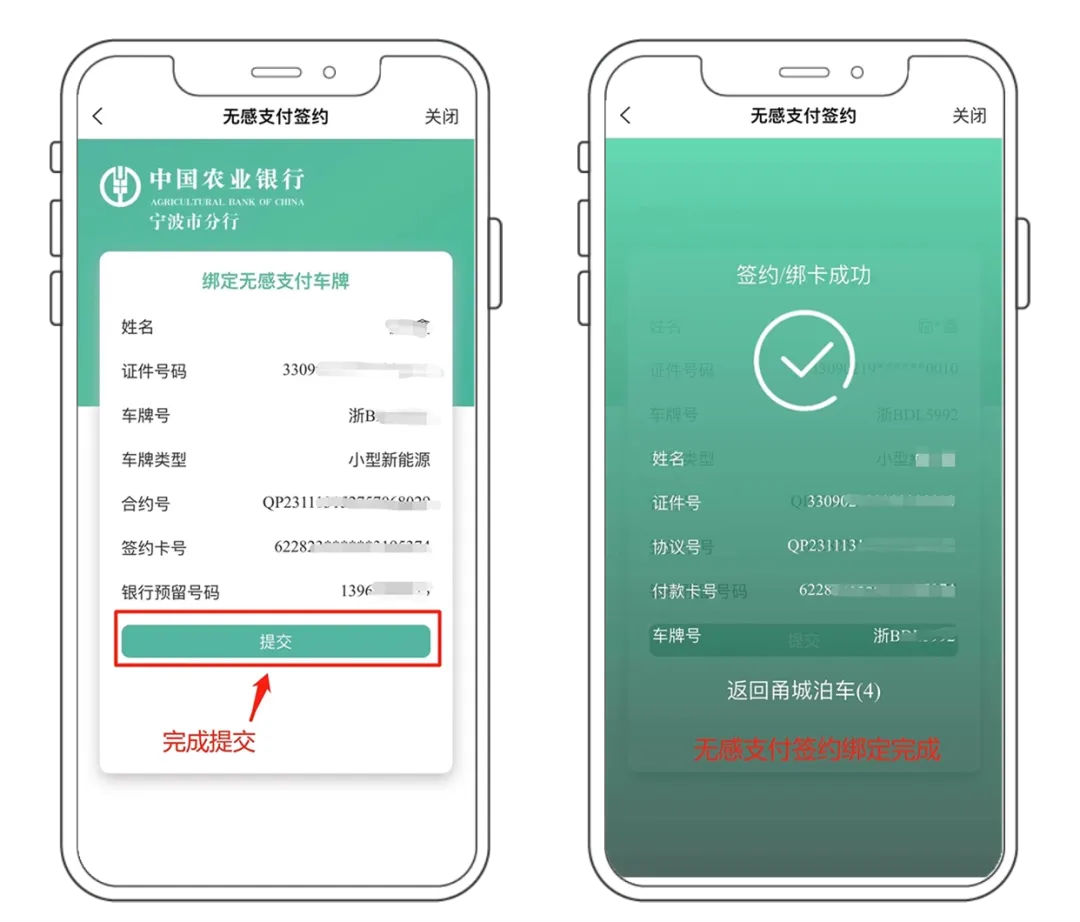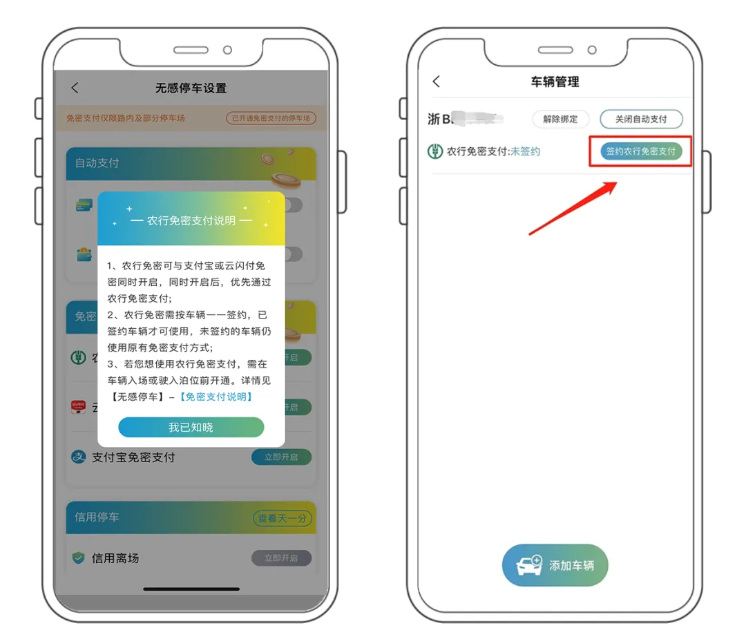 用户进入【甬城泊车】APP 后,点击【无感停车】后,点击【签约农行免密支付】,完成免密支付绑定。