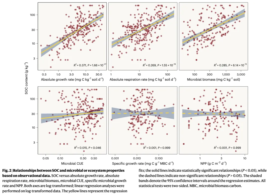 预测能力对比:观测数据表明,SOC与微生物绝对生长速率呈显著正相关(R² = 0.371),而与CUE的相关性极弱(R² = 0.015)。微生物生长速率是比CUE更强的SOC预测因子。