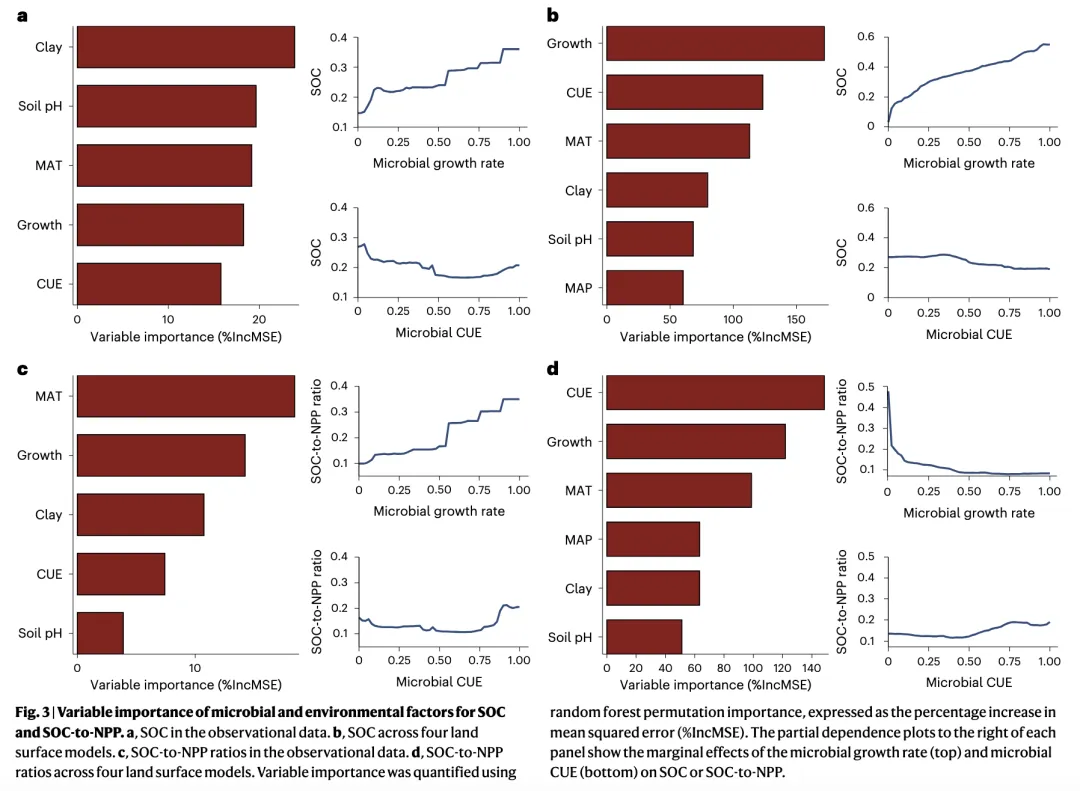 研究方法:本研究整合了全球范围内268对基于¹⁸O-H₂O标记法测定的微生物生长速率和CUE观测数据。同时,利用四种陆面过程模型(ORCHIDEE-CENTURY, ORCHIDEE-MIMICS, JULES-RothC 和 CABLE-CASA)进行全球模拟,并引入机械隐喻框架:将微生物生长速率比作驱动碳通量的“发动机”,将CUE比作调节碳分配的“变速箱”。通过随机森林回归和双变量回归分析,对比了微生物性状、非生物因素(气候、粘粒含量等)及植物输入(NPP)对SOC及其周转效率(SOC/NPP)的解释力。