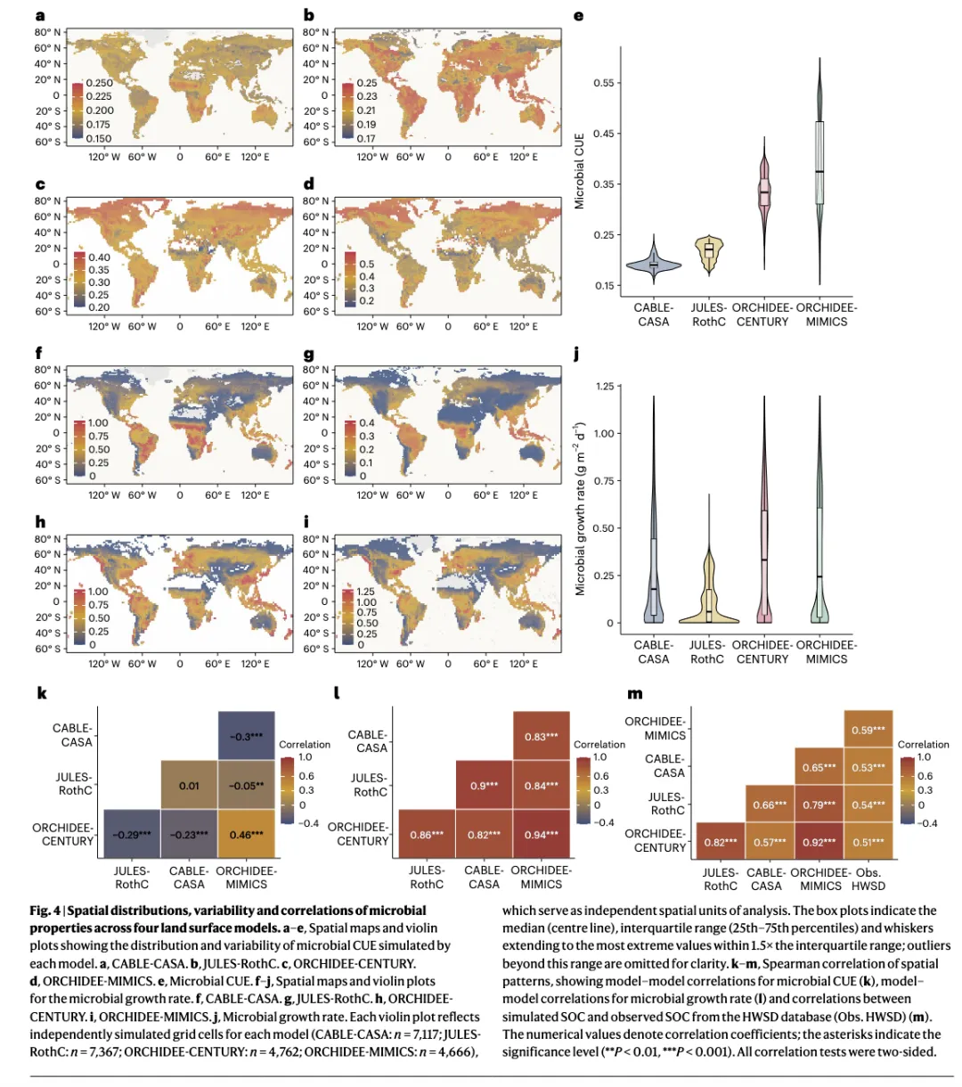 模型与观测的偏差:现有的陆面模型虽然捕捉到了生长速率强于CUE的特征,但普遍过度强调了微生物生理性状的影响,而低估了非生物控制因素的作用。