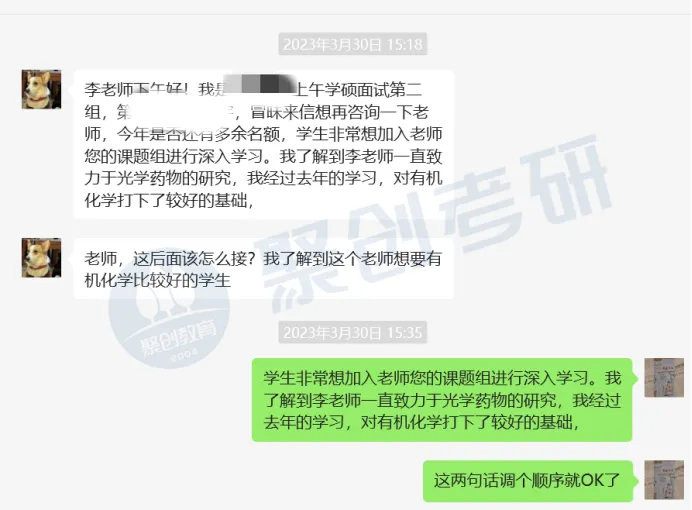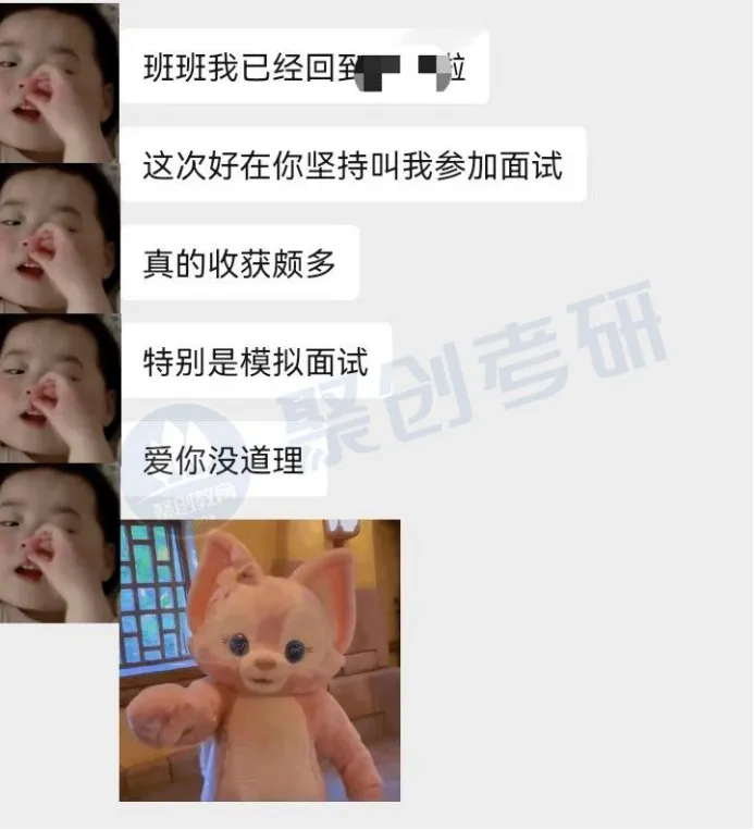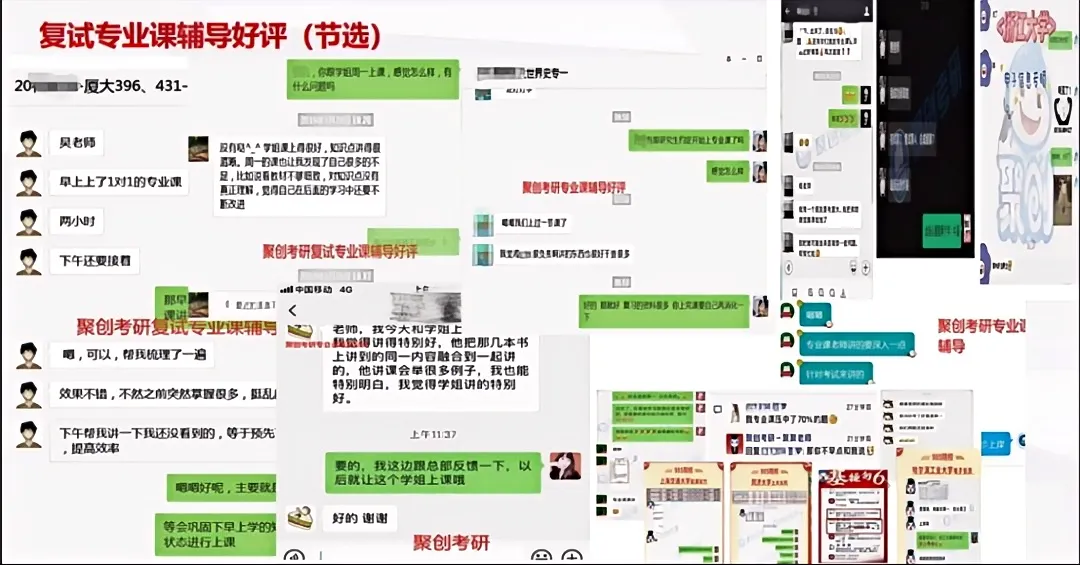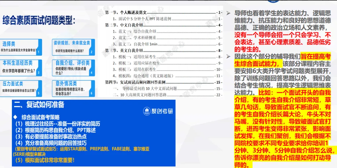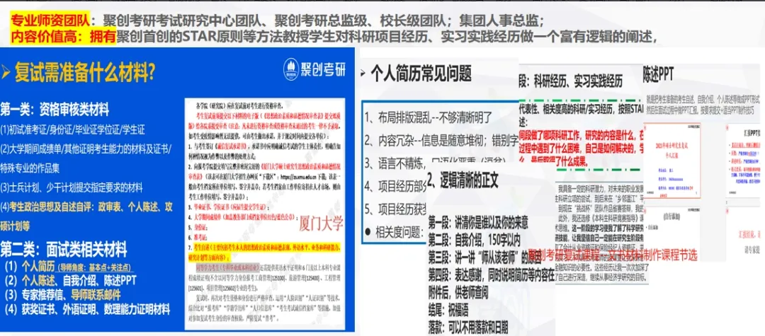 英语口语、简历制作、导师联系技巧方面是由聚创复试专职老师来授课(授课老师均来自985、211高校),因为复试都是学校自己组织的,能不能掌握到第一手信息对复试备考是至关重要的。专业课因为现在导师不能外出授课,所以都是邀请目标院校目标专业直系研究生来进行辅导。