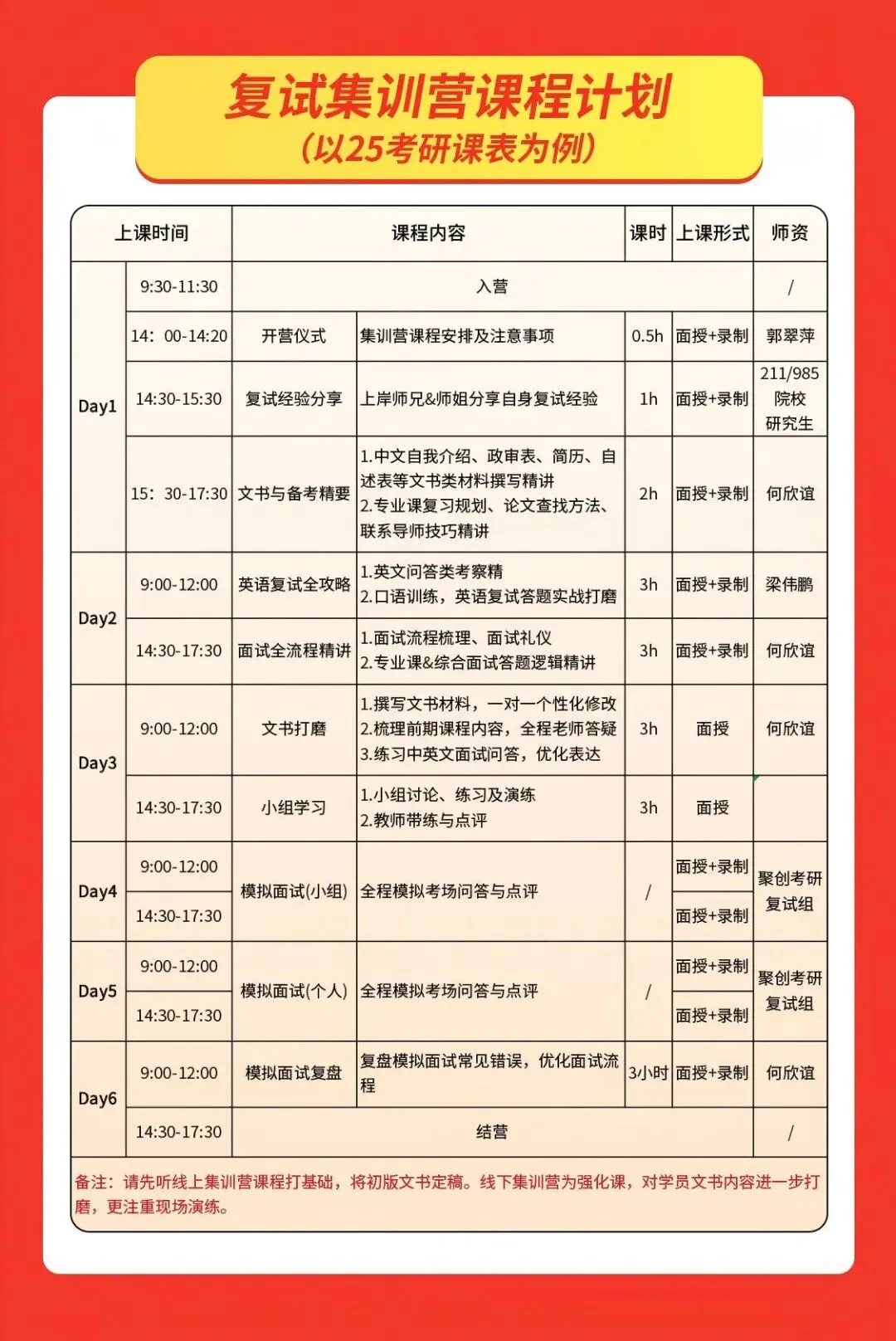 6天5晚复试集训营根据同学个人需求可以选择走读或寄宿,6天5晚高强度训练,会有老师每天坐班答疑,这个内容主要是 :