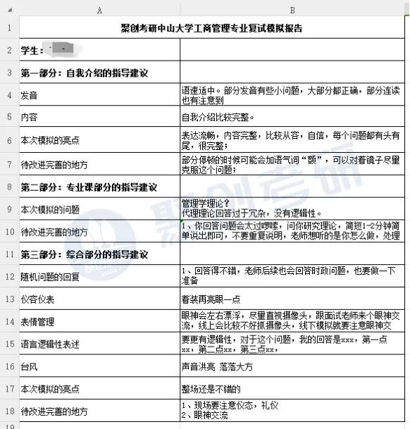 针对考生报考院校专业的复试面试流程对考生做实战模拟,还原实际考研复试场景,从进场-问答-出场帮考生模拟,并深入点评,出具模拟面试报告,纠正面试表现不好的地方,反复模拟!报名复试辅导课程的同学会先安排线上直播课,补充复试常识,对复试与调剂有一个初步了解,能够保证后期上面授课时能够跟上紧张的上课节奏,更好的吸收相关内容~