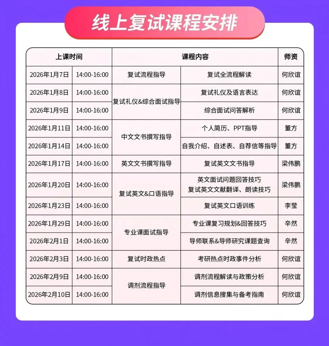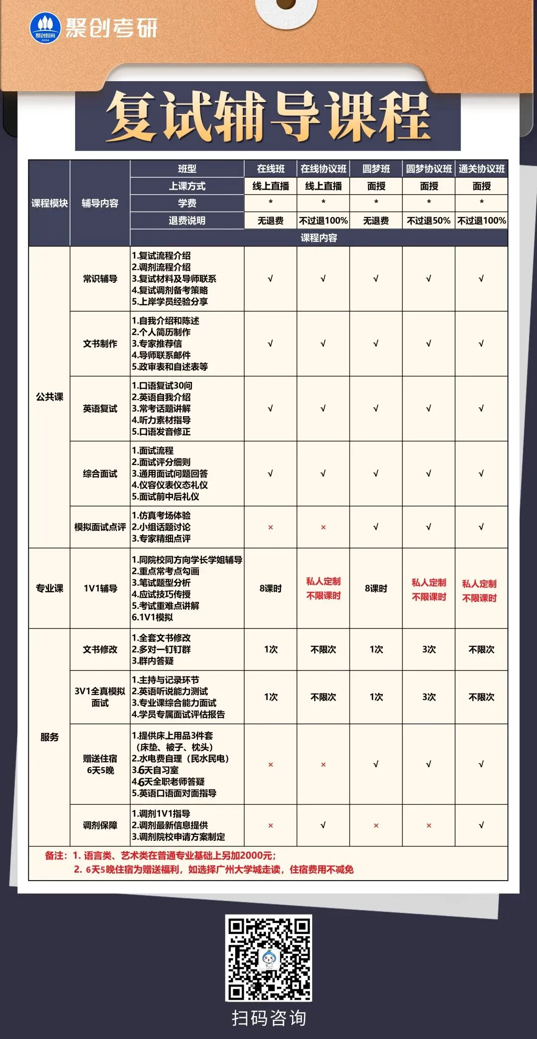 针对今年26考研 ,我们聚创主要服务内容是复试线上集训营+6天5晚的复试集训营+专业课定向一对一辅导,另外还有调剂1V1指导,帮你解决复试调剂过程中遇到的所有难题!
