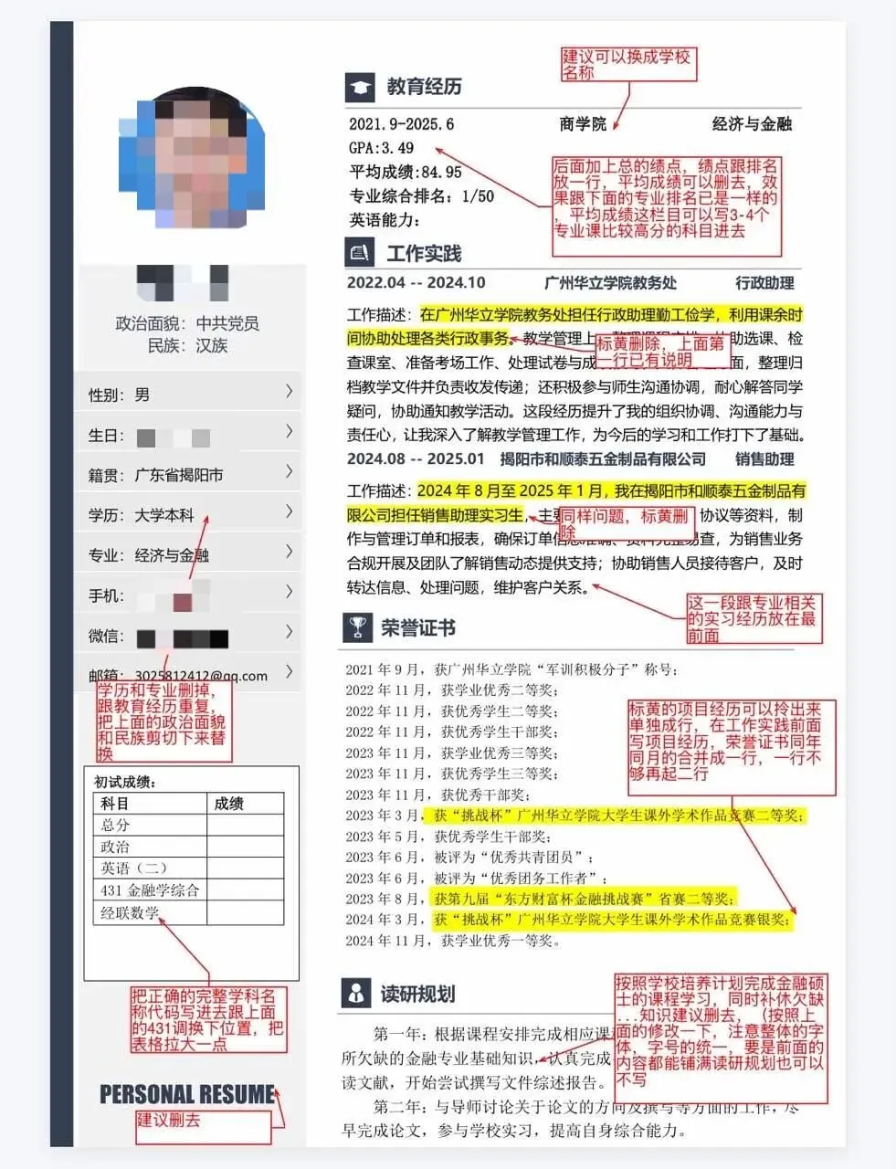 如第三天的文书讲解,老师会详细介绍复试过程必备的文书材料格式要求、 中文简历怎么写、个人陈述PPT怎么制作、导师邮件怎么撰写等等