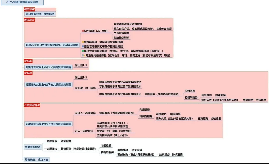课程服务有个性化复试备考规划+复试文书材料修改+多对一专属服务群+全真模拟面试+1V1调剂数据整理+不过退费协议。多种班型多种服务自由组合,可以满足你的各种上课需求。