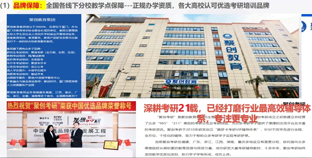 聚创考研专注考研辅导21年,具有正规办学资质,业务覆盖广东、福建、江西、浙江、重庆、湖南等全国各地,多省市高校校企合作单位,资源渠道丰富!