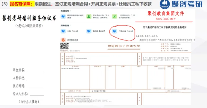 报名聚创考研任意课程都会签订《聚创考研培训服务协议书》,复试不录取就退费,根据所选班次退费规则严格写入合同,保障同学合法权益。