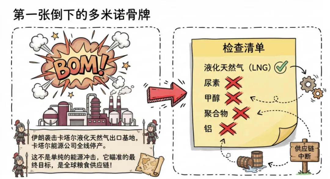 这不是一场单纯的能源冲击,这是一张多米诺骨牌,第一张倒下的是液化天然气,紧接着倒下的是化肥,而它瞄准的最终目标,是全球的粮食供应链!