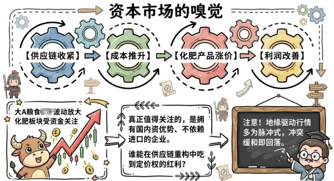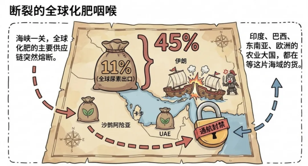而海峡一关,等于化肥的主要供应链突然断了,那化肥不就得跟着涨价?