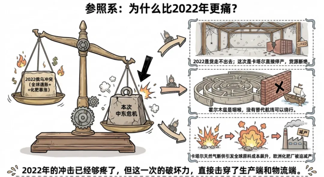 第一,俄罗斯当时是贸易受阻,货还在,只是走不出去;而这次是连生产都停了,卡塔尔的工厂直接停产,货源本身就断了。